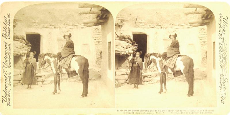 Se-rja-bankaa (Desert Blossom) and Ta-bu-hooja (Little Rabbit), two Moki women at Sichomovi (Mound of Blossoms), Arizona. The photo shows one woman standing, at left in front of a pueblo doorway, and the other mounted on a pinto horse. Both girls wear the traditional butterfly hairdo of unmarried women. The photo was copyrighted in 1901 by Underwood and Underwood. Works and Studios in Arlington, N.J., Littleton, N.H. and Washington D.C. No photographer noted. Focus is good, contrast is medium—slightly light in tone. Tan matting. 3.5 x 7."