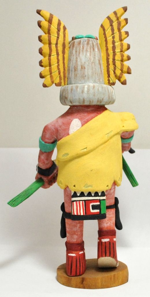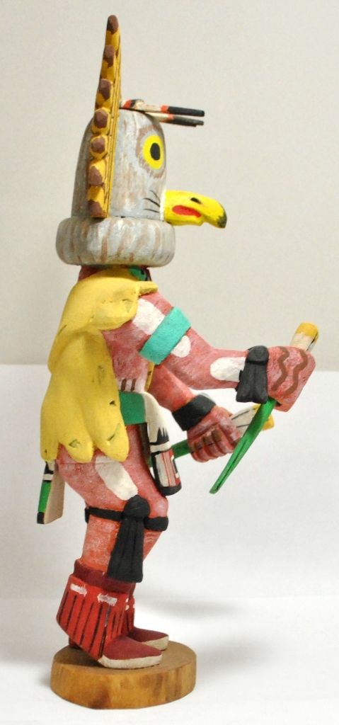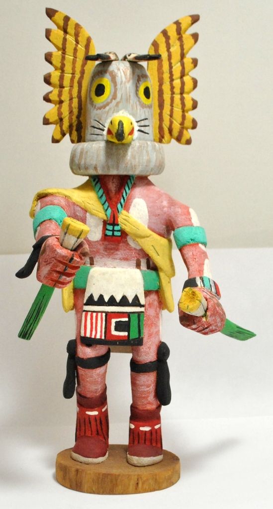 Measures 8" tall by 4-1/4" wide by 4-1/4" deep. Figure is "Mongwa" (Great Horned Owl) carved by Hopi artist Shirley Adams from the Polacca Hopi Reservation. One of a kind, the entire piece is carved from a single piece of cottonwood. NOTE: Artist signed name and info in marker on the bottom of the kachina (see picture). Can probably be sanded off if desired, but we are selling it as came to us.