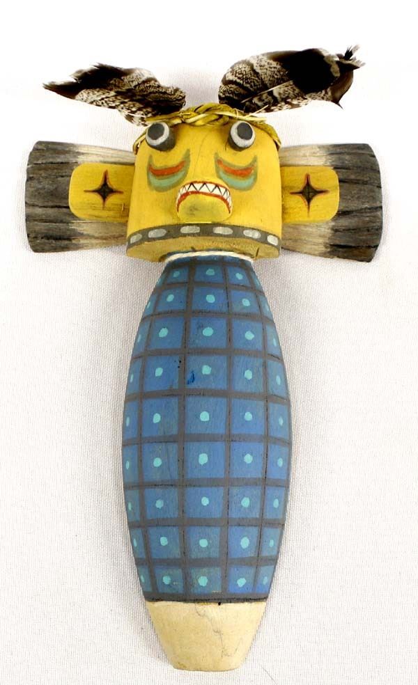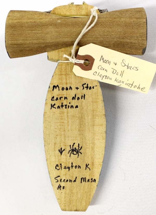 Native American Hopi Moon & Stars Corn Kachina by Clayton Kaniatobe of 2nd Mesa, measures 5.5'' x 7'', embellished with feathers and woven fiber headband, signed on back