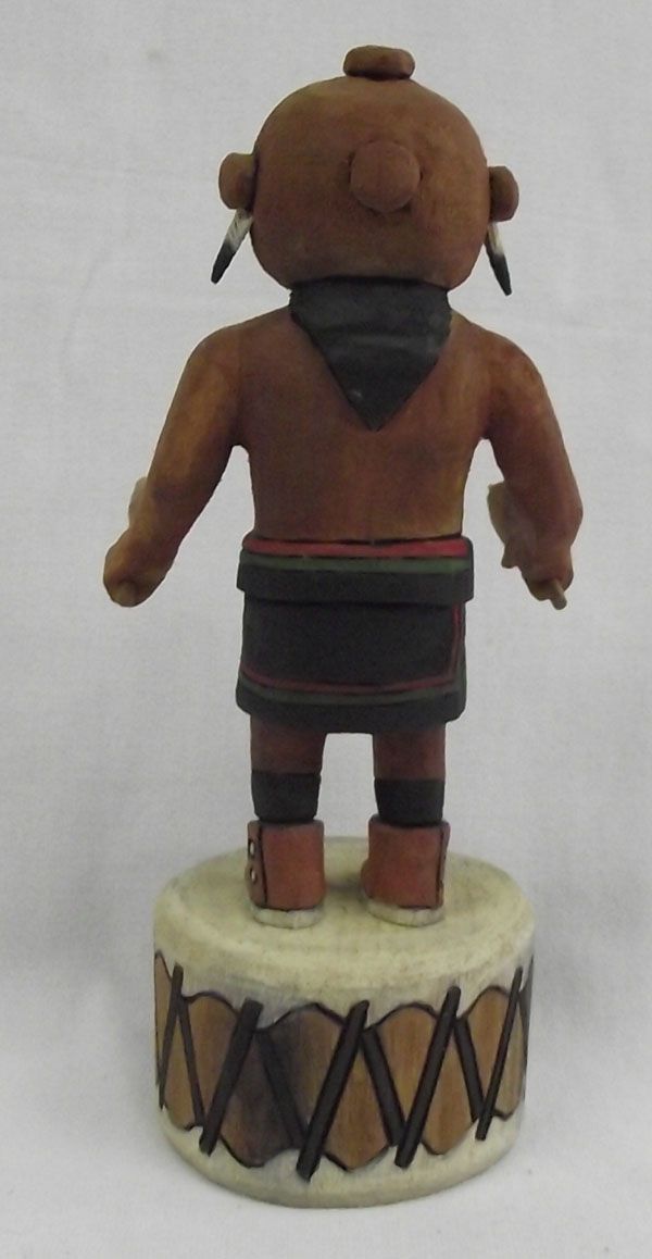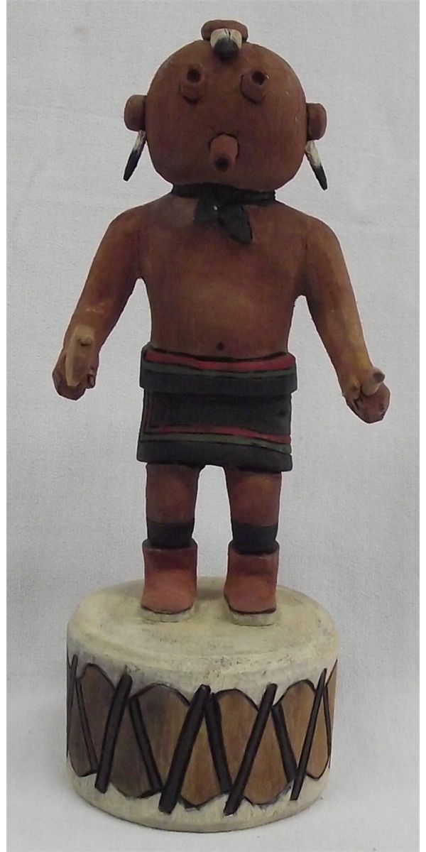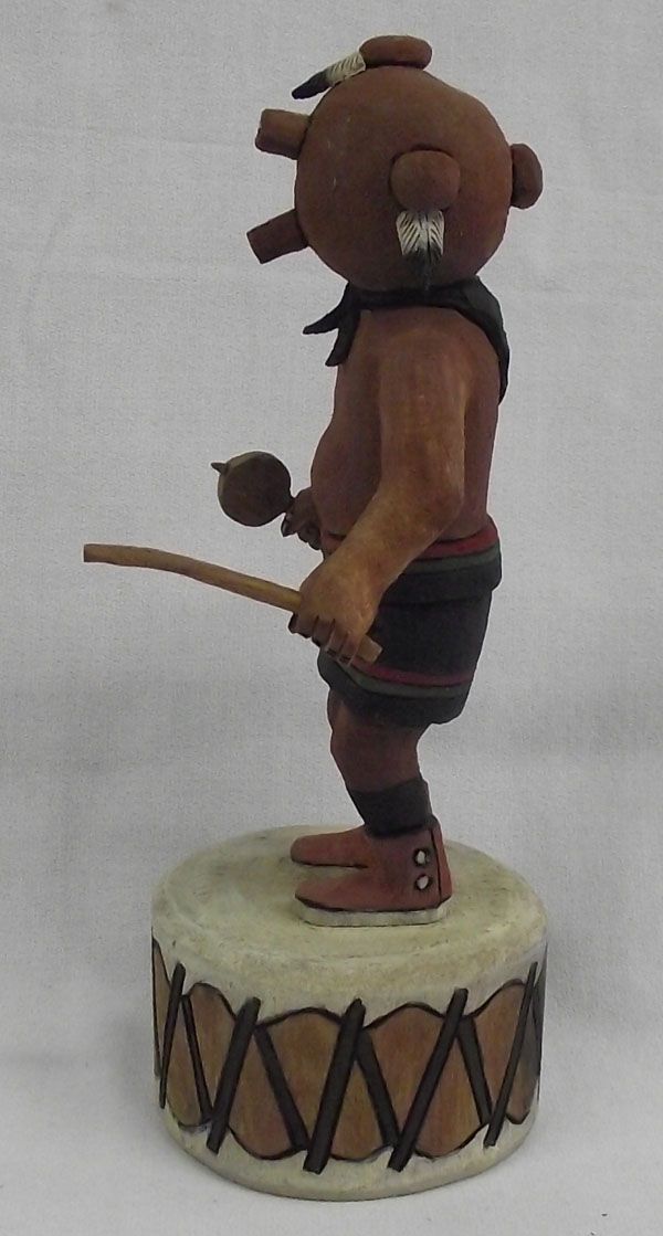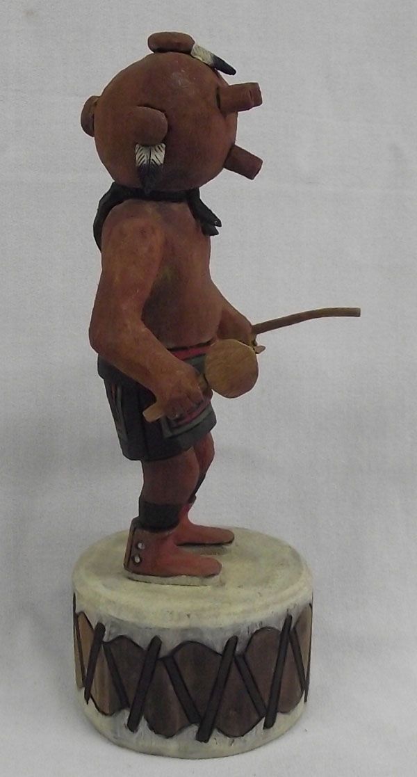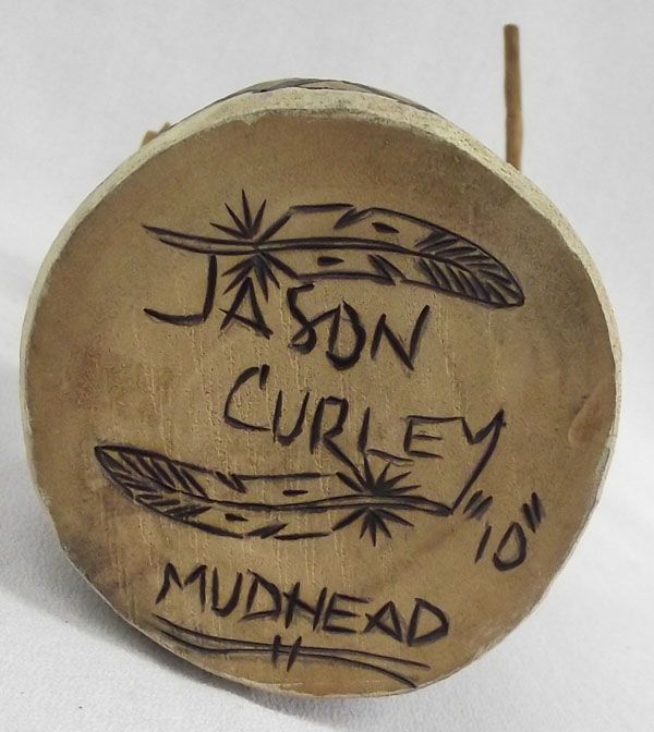 From the collection of Nick & Suzanne Nicholas. Hopi Mudhead Kachina by Jason Curley, measures 8''h x 3.5''w. Native drum base, holding dance stick and rattle. Wood burned signature with eagle feathers, ''Mudhead''.
