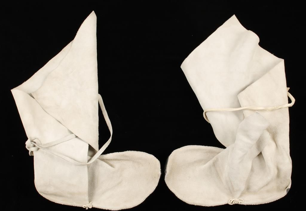 Rigged soles and soft deerskin uppers. Very well crafted, one piece sewn to the sole from instep to instep around the toe, covering the front of foot and forming the tongue. The second piece is sewn around the heel and then wrapped about the ankle, this upper piece also overlaps on the exterior of the foot and is tied together with leather thongs. The tops of the ceremonial moccasins are then turned down to form a cuff with the longer tabs outside, thus concealing the opening. Each moccasin measures 11" in length and 4.5" in width and 10.5" tall. Excellent condition with light use. Very unique and collectible.