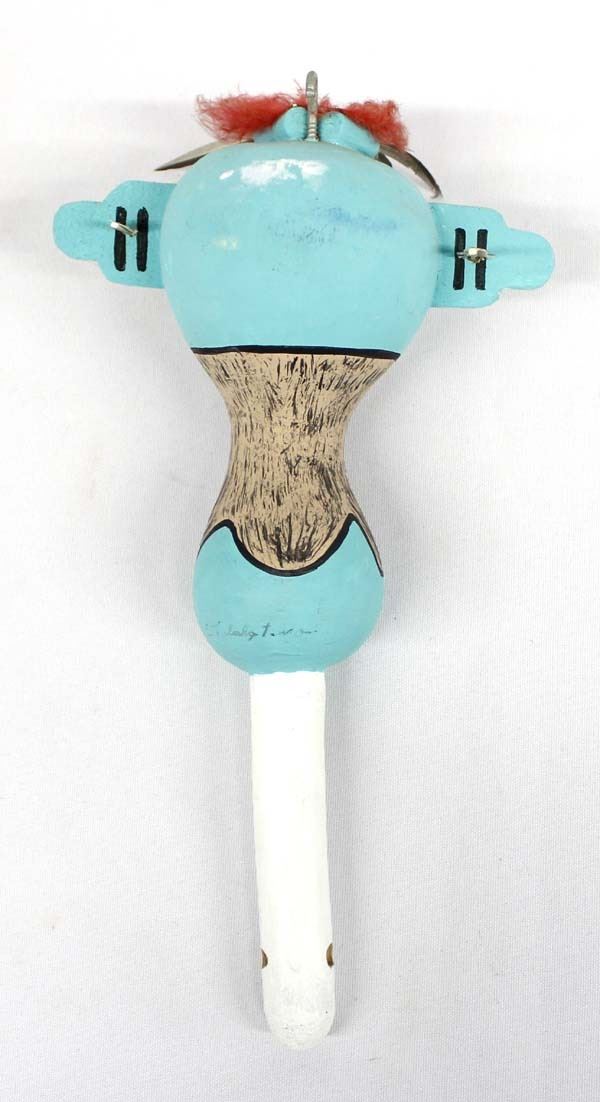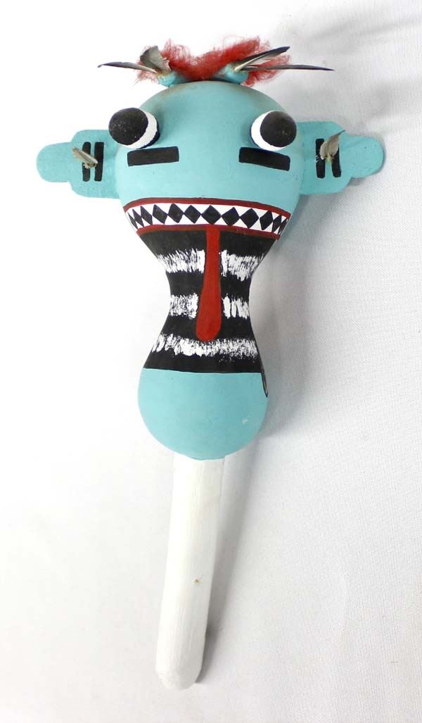 Native American Hopi Hand Painted Ogre Gourd Rattle by E. Talahytewa, measures 10''L x 5'' and signed by the artist, embellished with feathers
