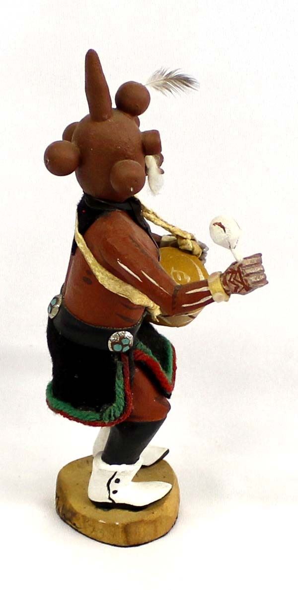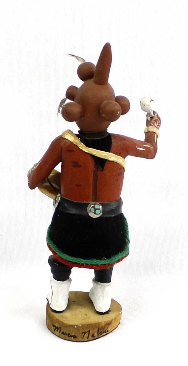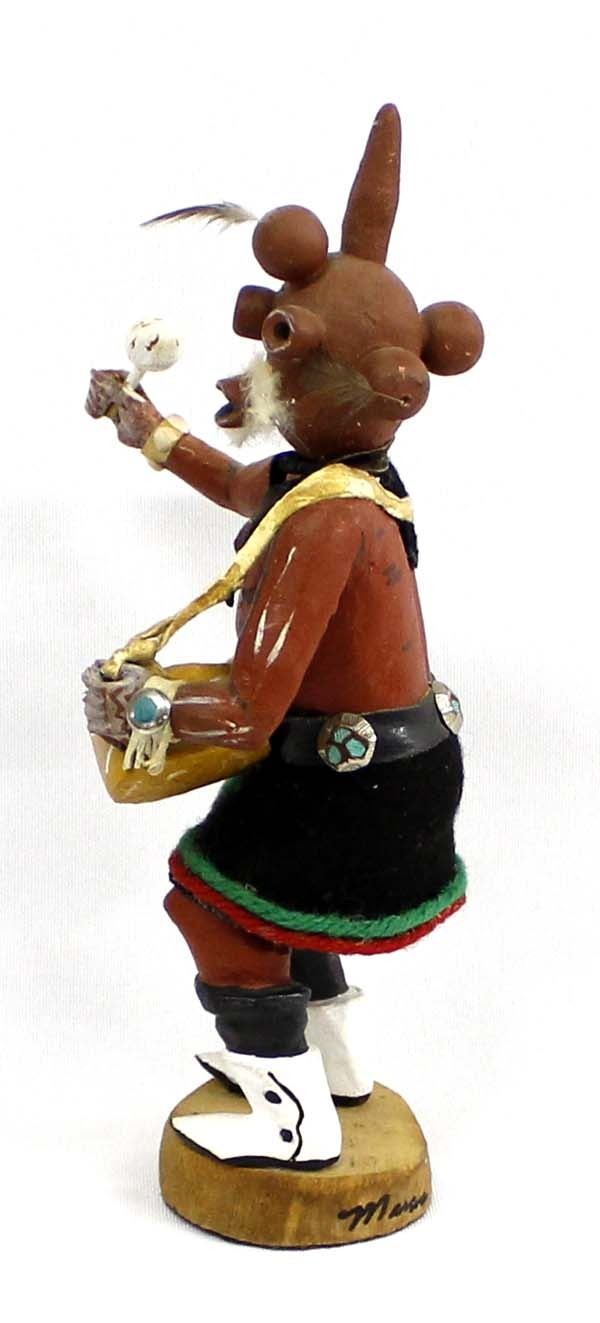 Native American Hopi ''Old Man Mudhead'' by Marcus Nahee, Seka Hata of 2nd Mesa, measures 8'' x 4'' x 2'' and is signed on the side of the base, embellished with leather, small metal piece on bracelet, metal conchos on belt, yarn, rabbit fur, and feathers, holding drum and rattle