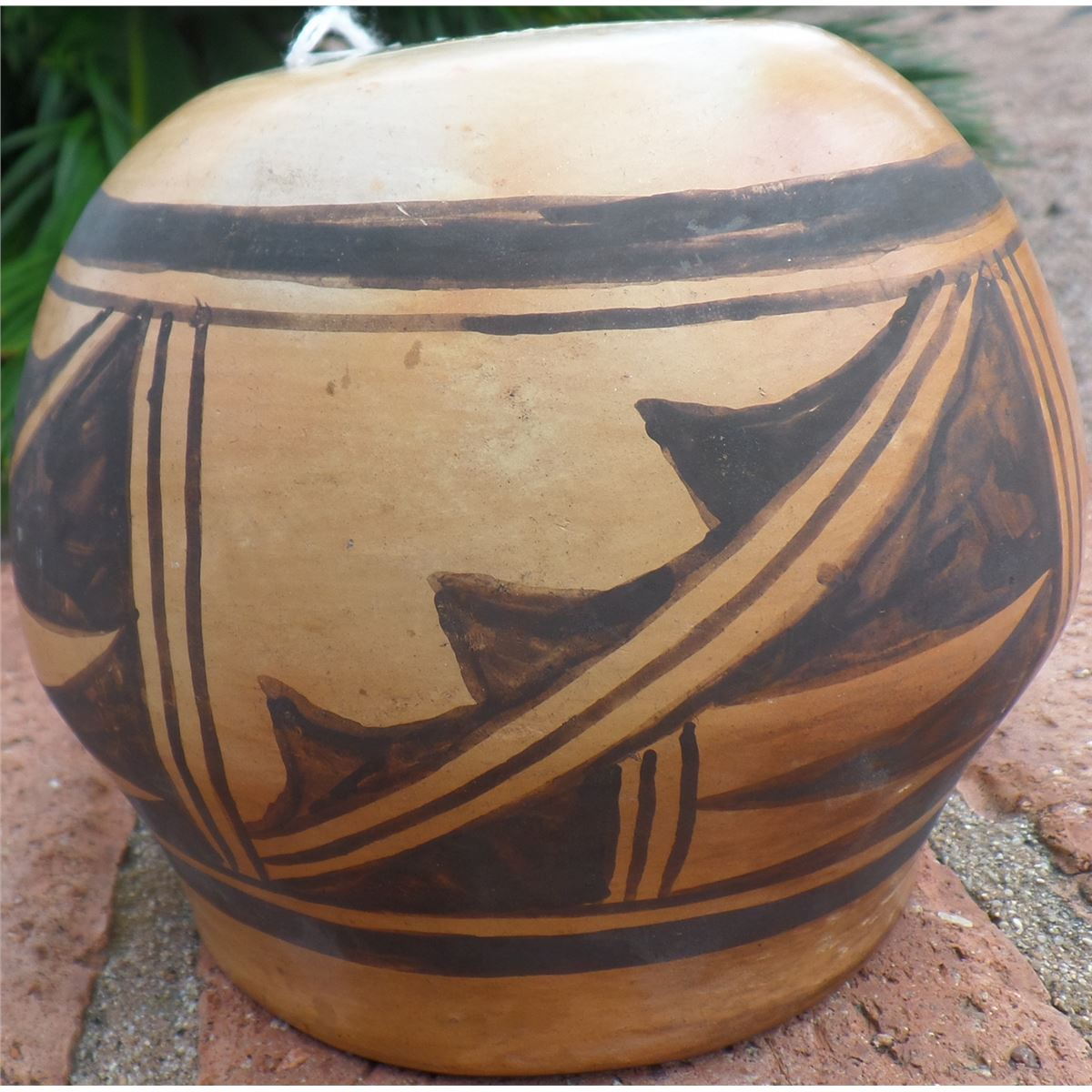 Approximately 1940's Hopi Olla measuring 4.5 x 5.5. inches. This is dated approximately 1940's. Condition is Great, See images. The Hopi Olla with stylized design of burnt orange and black. Shipping: $20.00