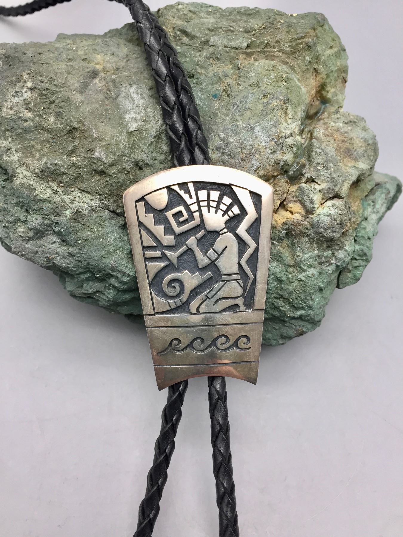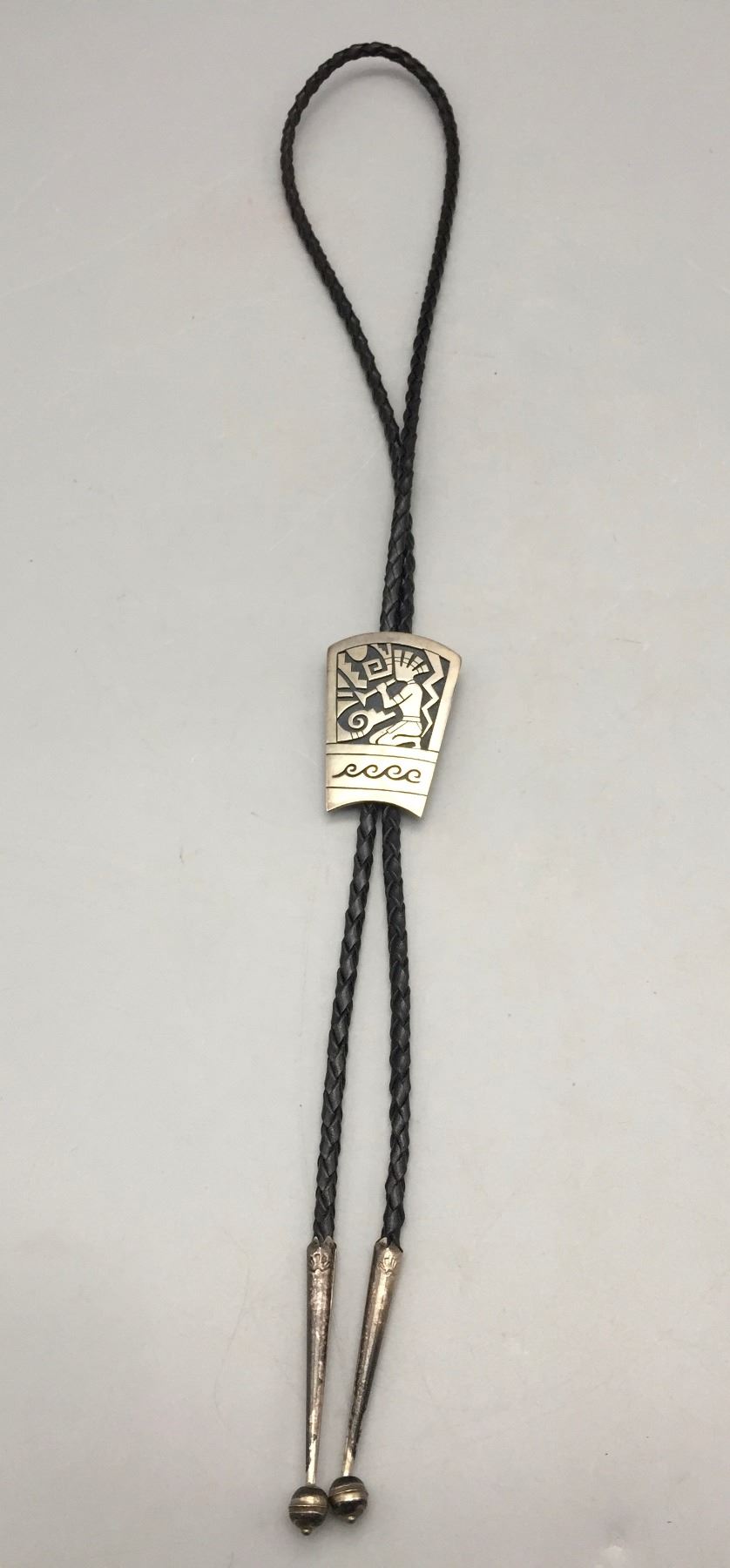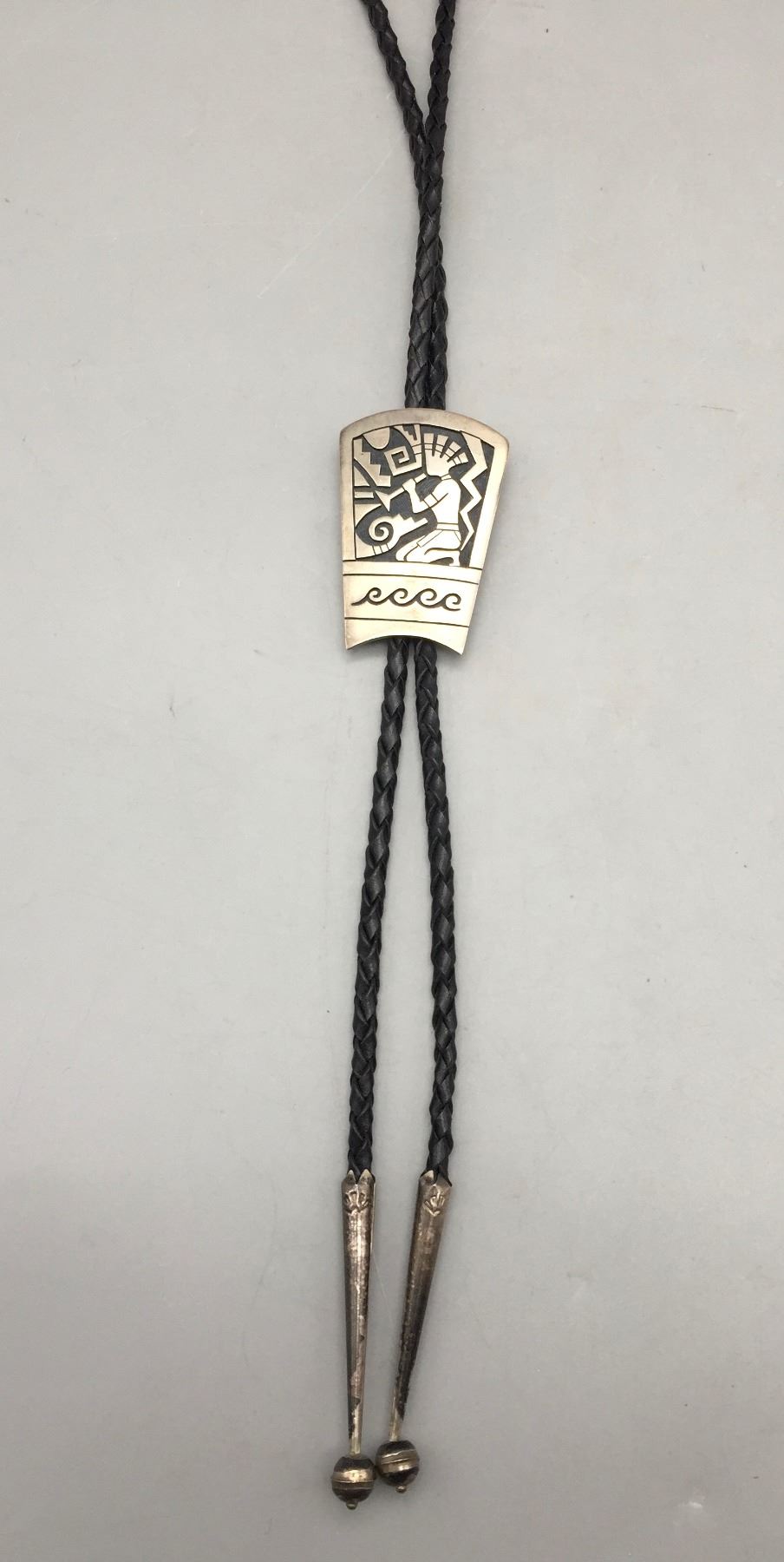 Description: Offered to you in this lot is great Hopi overlay bolo tie. It has Kokopelli and other geometric patterns. Also has sterling silver tips. Stamped as sterling silver.                                                                                                           Maker: Hallmarked with a spiderweb with a spider, Vern Mansfield Jr., Hopi.                                                                                                                      Approx. Age: Circa 1990s.                                                                                                            Size:  Total length 19”. Slide measures 2 1/8” long x 1 1/2” wide. Weighs 40.9 grams.                                                                                                                                                                                                                                Condition: Good for its age, normal wear expected.                                                                                                                Please look closely at the pictures - they are an important part of our description.                                Shipping: There will be a $5 handling / packaging fee for shipping this lot. The actual cost of postage will be added on top of that.