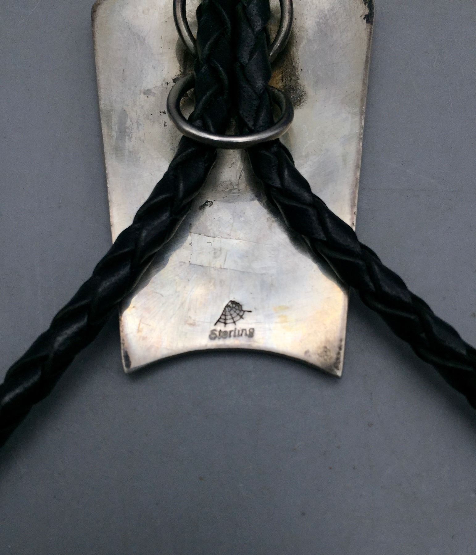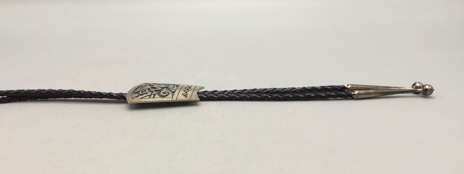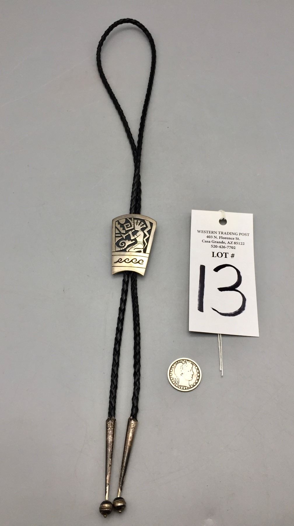 Description: Offered to you in this lot is great Hopi overlay bolo tie. It has Kokopelli and other geometric patterns. Also has sterling silver tips. Stamped as sterling silver.                                                                                                           Maker: Hallmarked with a spiderweb with a spider, Vern Mansfield Jr., Hopi.                                                                                                                      Approx. Age: Circa 1990s.                                                                                                            Size:  Total length 19”. Slide measures 2 1/8” long x 1 1/2” wide. Weighs 40.9 grams.                                                                                                                                                                                                                                Condition: Good for its age, normal wear expected.                                                                                                                Please look closely at the pictures - they are an important part of our description.                                Shipping: There will be a $5 handling / packaging fee for shipping this lot. The actual cost of postage will be added on top of that.