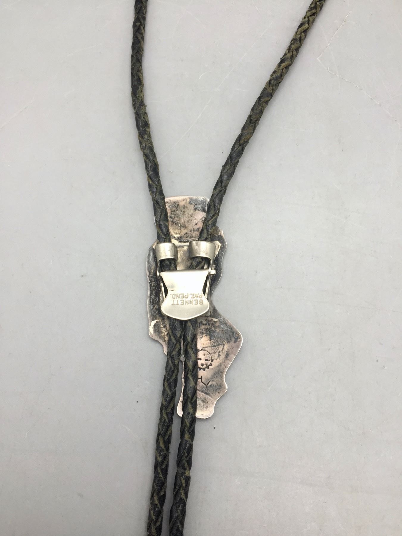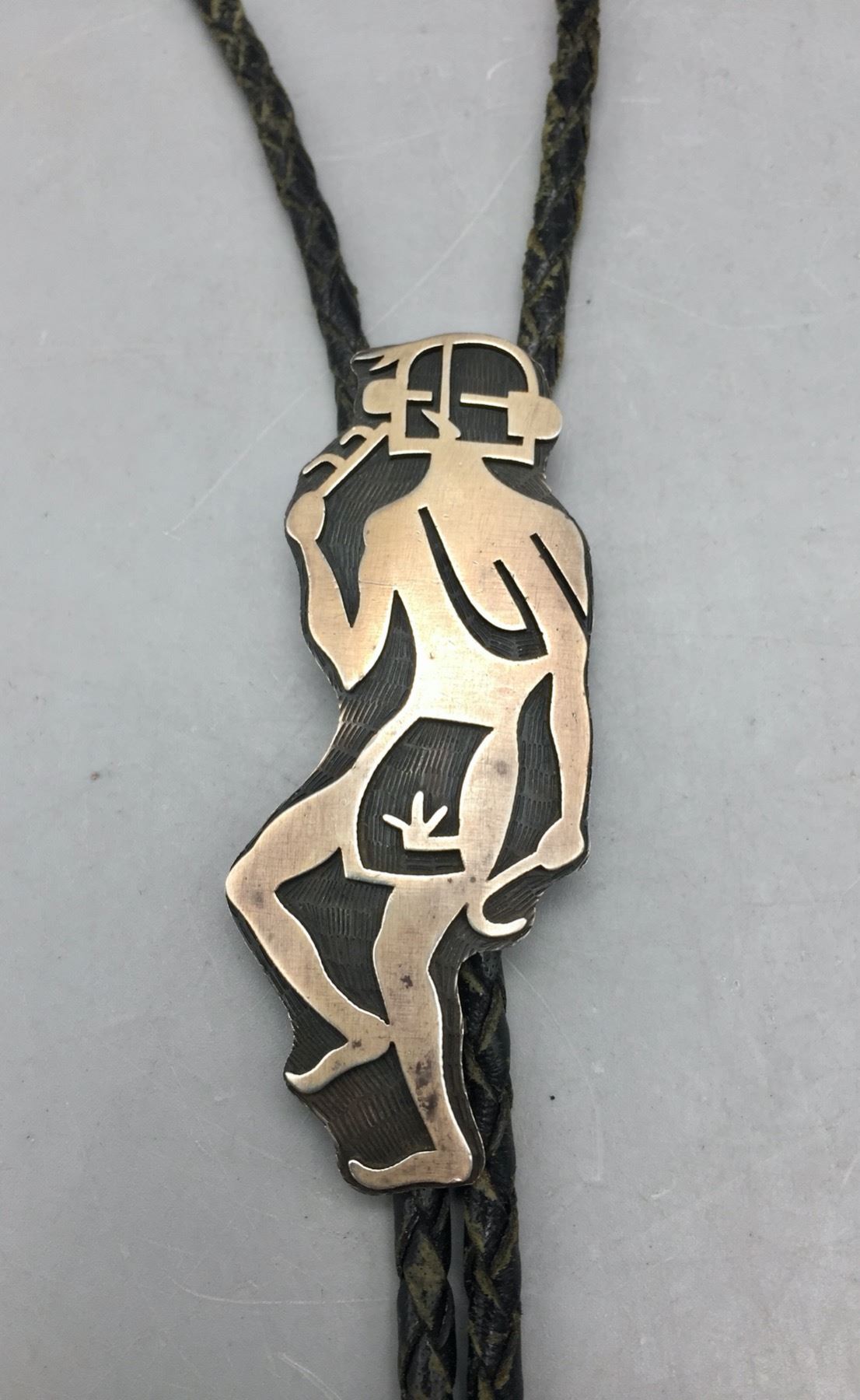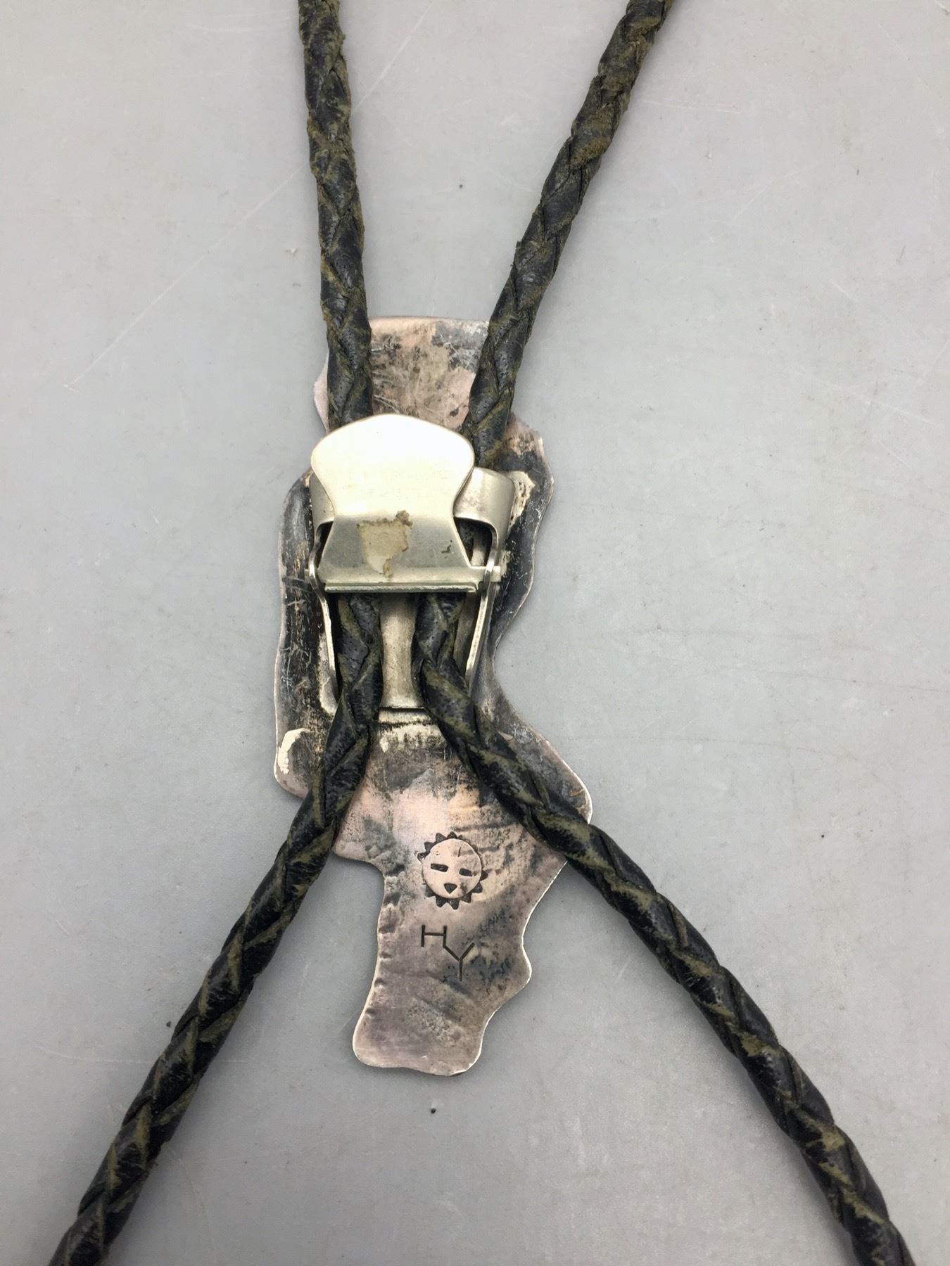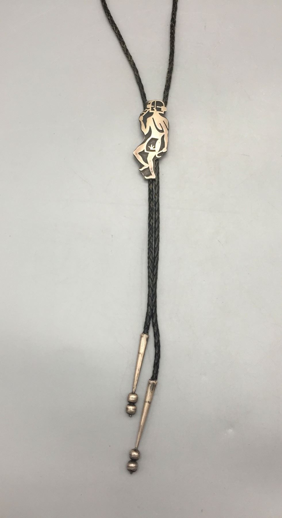 Description: Presented for sale in this lot is great sterling silver Hopi overlay bolo tie. It features a Kachina dancer theme and has sterling silver tips. Maker: Hubert Yowytewa, Hopi. Approx. Age: Fairly modern. Size: Cord is 42” long. Slide measures 2-5/8” long X 1” wide. Weighs 36.6 grams. Condition: Good for its age, normal wear expected. Please look closely at the pictures - they are an important part of our description. Shipping: There will be a $5 handling / packaging fee for shipping this lot. The actual cost of postage will be added on top of that.