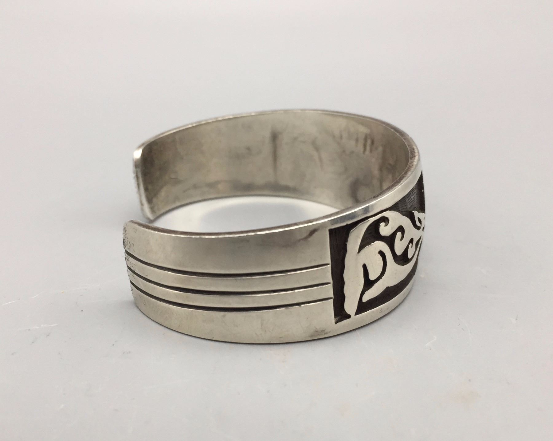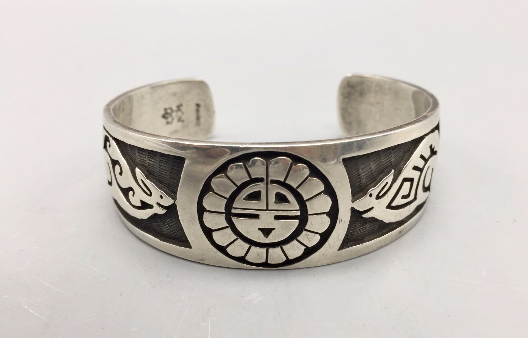 Description: Sterling silver Hopi overlay bracelet. Maker: Aaron Honannie, Hopi. Approx. Age: Vintage. Size: Bracelet measures approx. 5 1/2“ inside circumference with a 1 1/8” gap (making this bracelet fit about a 6 5/8” wrist). 38.1 g. Condition: Good for its age, normal wear expected. Please look closely at the pictures - they are an important part of our description. Shipping: There will be a $5 handling / packaging fee for shipping this lot. The actual cost of postage will be added on top of that.