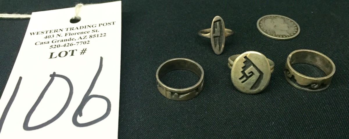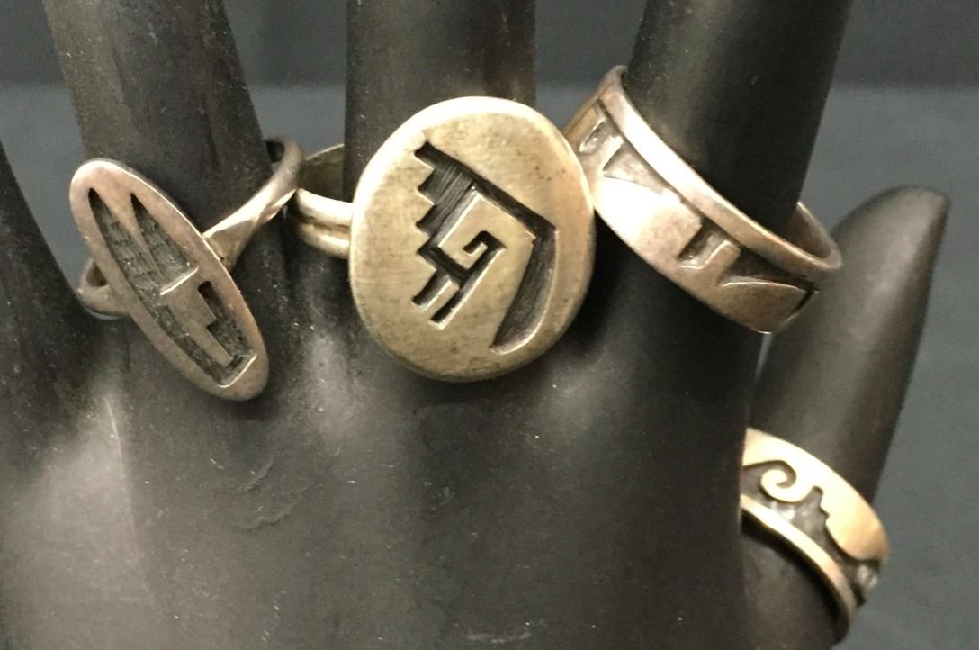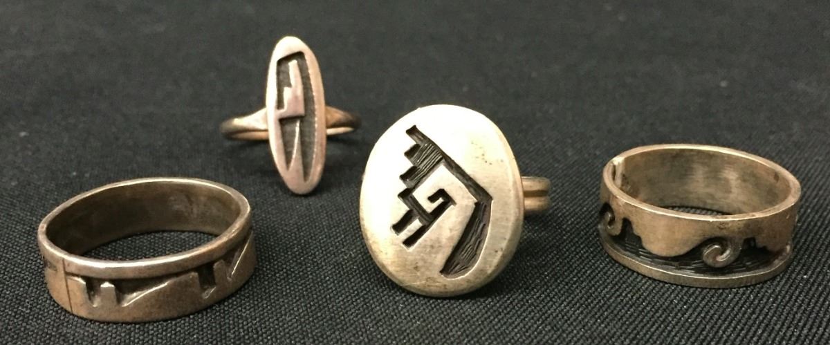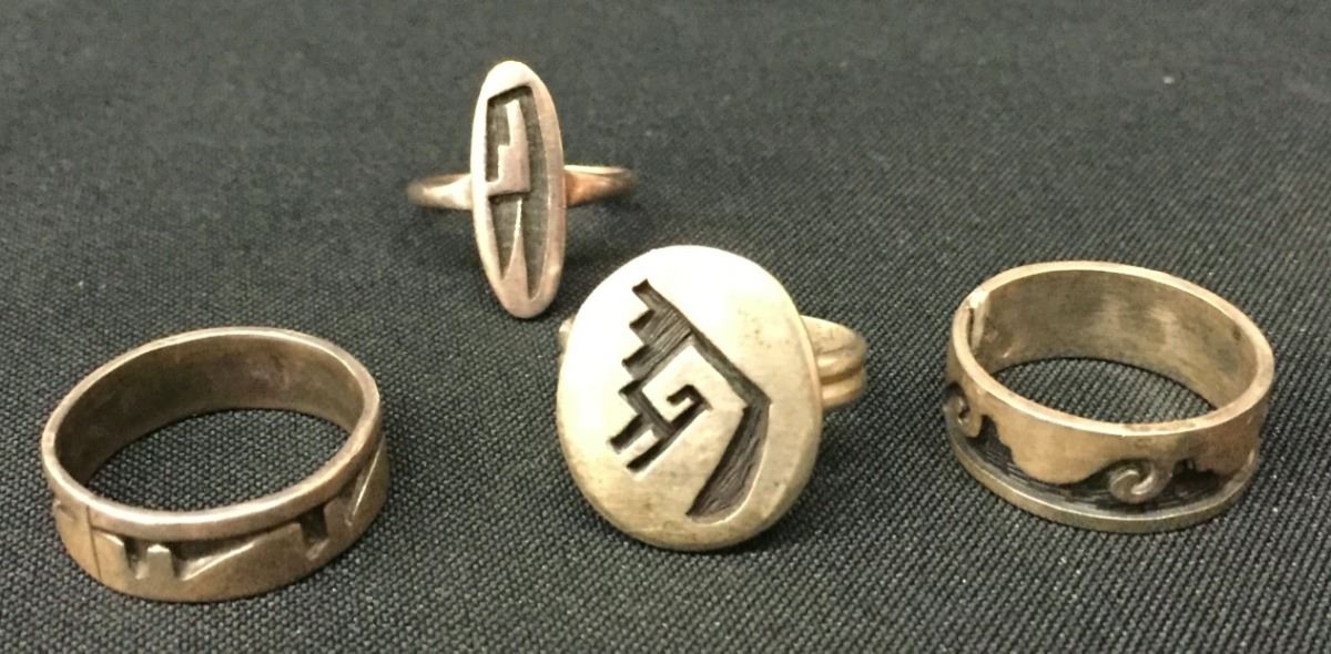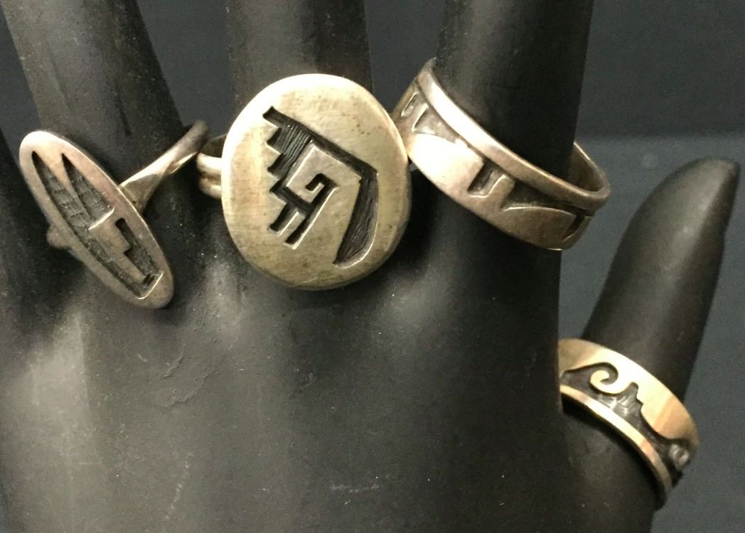 There are four different Hopi rings for one money in this lot. Collectively they weigh 17.4 g. Various sizes and styles. Please look closely at pics - they are an important part of our description. Shipping: There will be a $5 handling / packaging fee for shipping this lot. The actual cost of postage will be added on top of that.