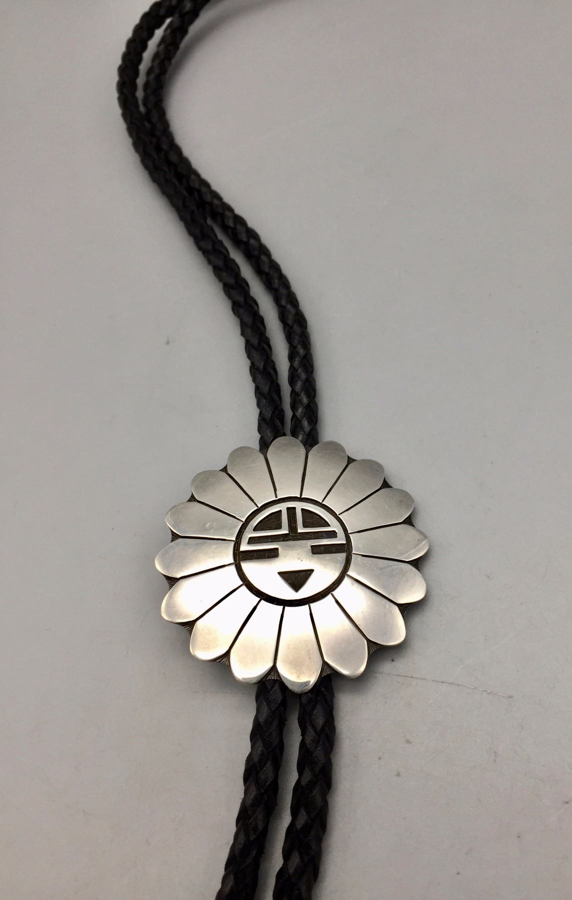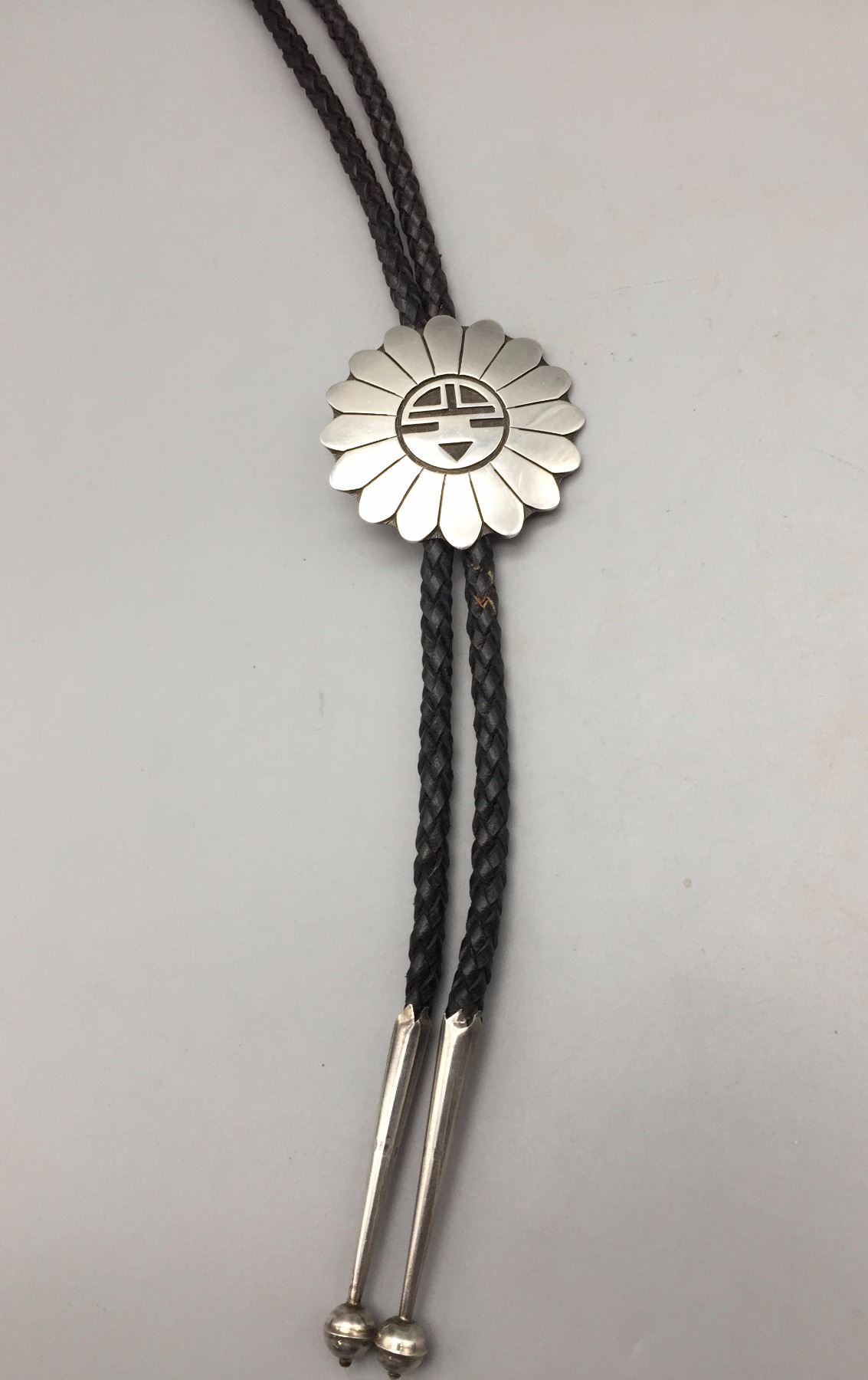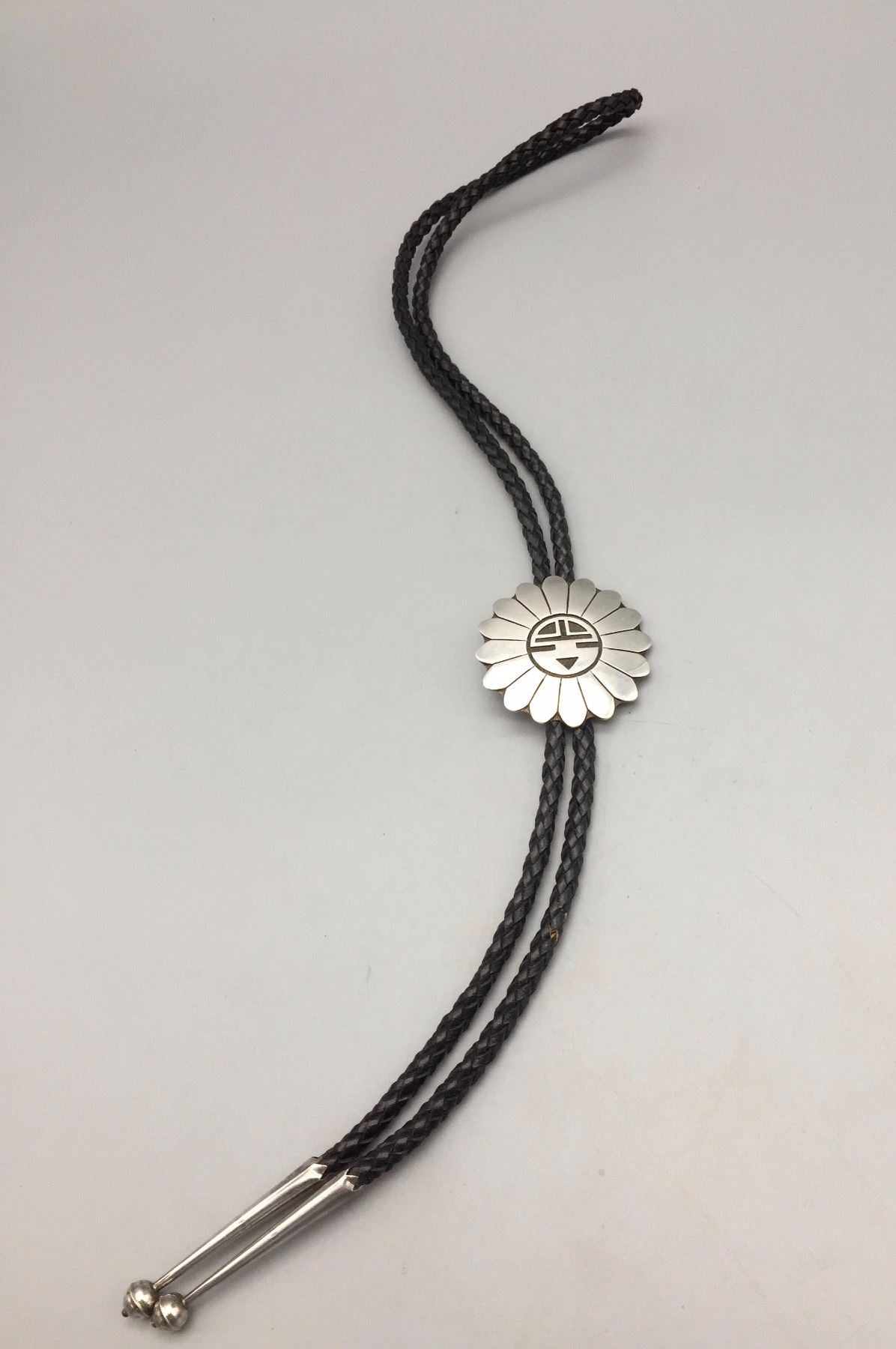 Description: Traditional Hopi designed bolo by Milson Taylor. Maker: Hallmarked with the mark of Milson Taylor, Hopi. Approx. Age: Circa 1980s - 90s. Size: Slide is approx. 1 7/8“. It's on a 40" braided leather cord with sterling tips. Weighs 47.9 grams. Condition: Good for its age, normal wear expected. Please look closely at the pictures - they are an important part of our description. Shipping: There will be a $5 handling / packaging fee for shipping this lot. The actual cost of postage will be added on top of that.