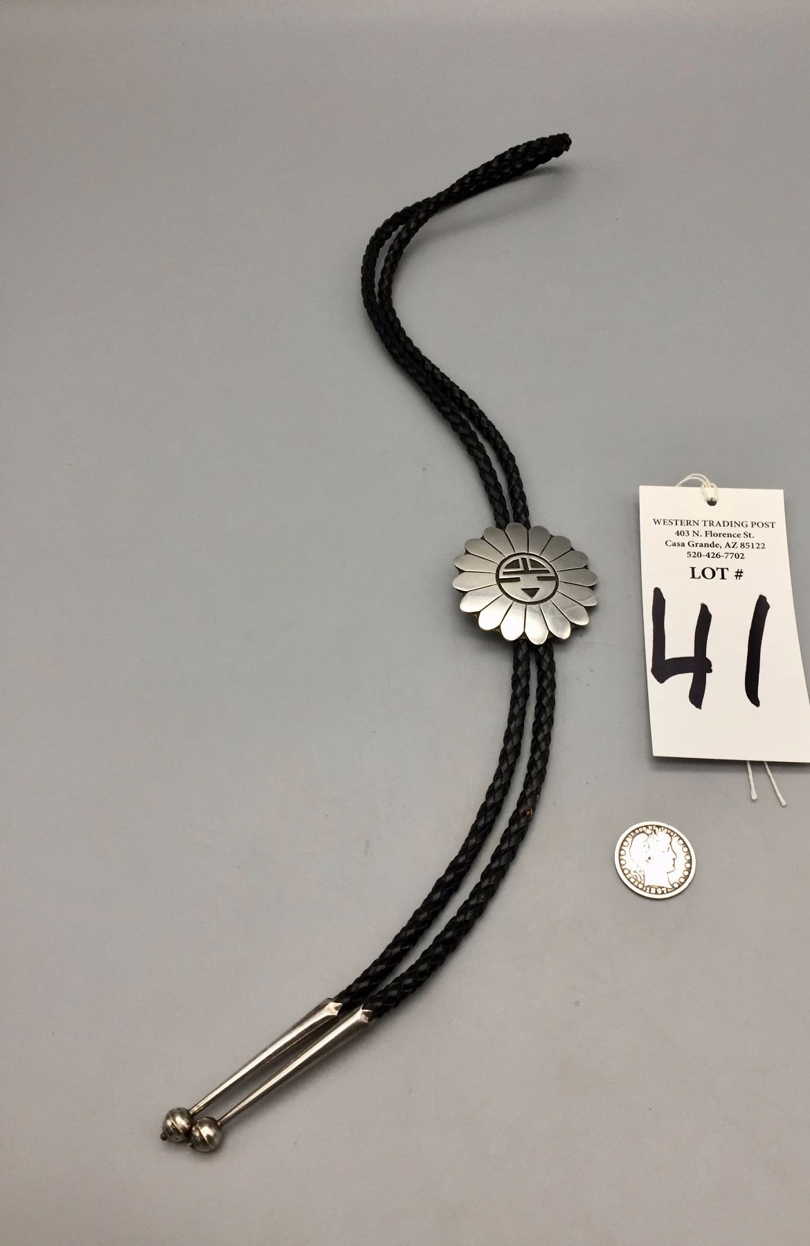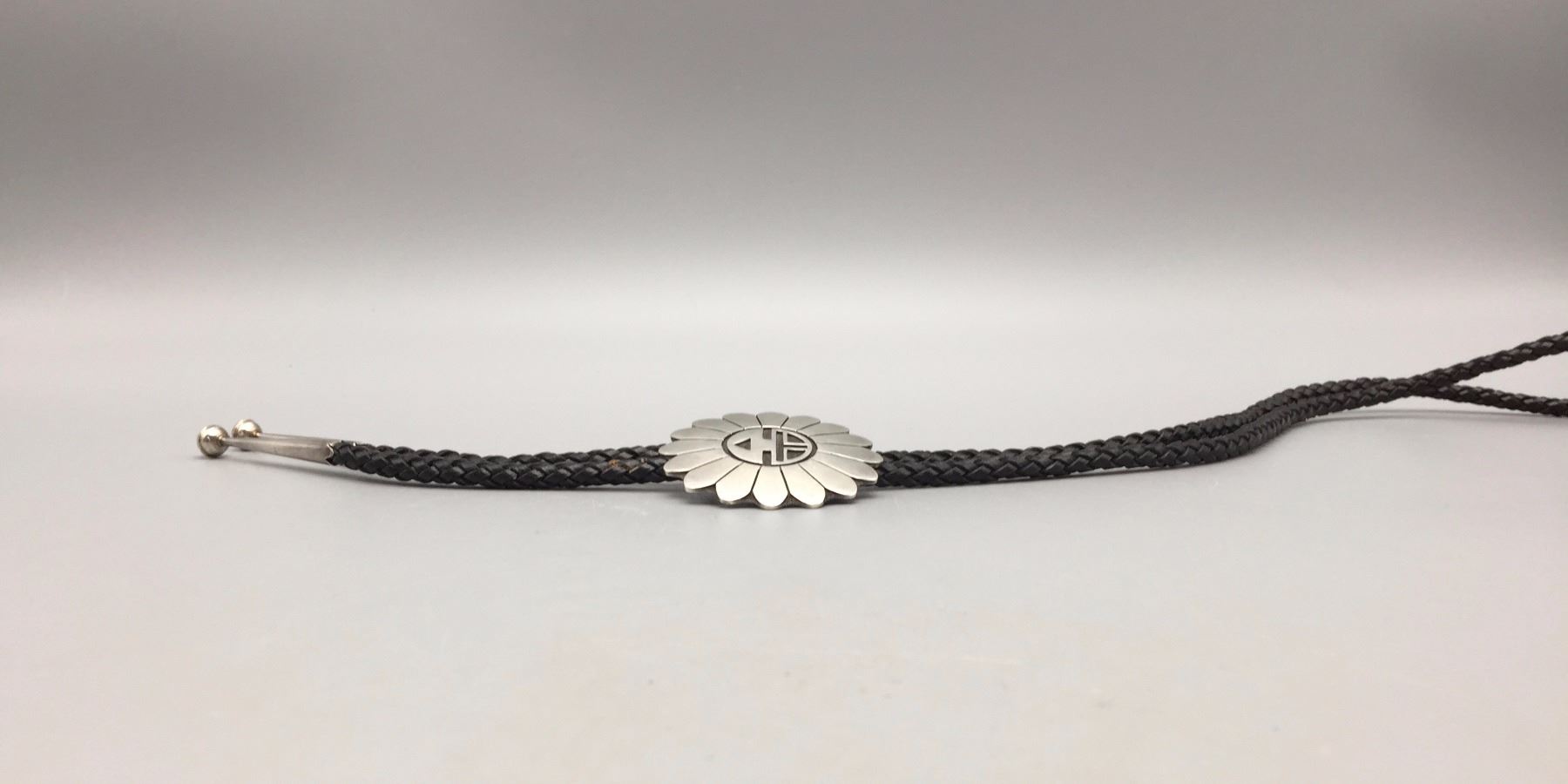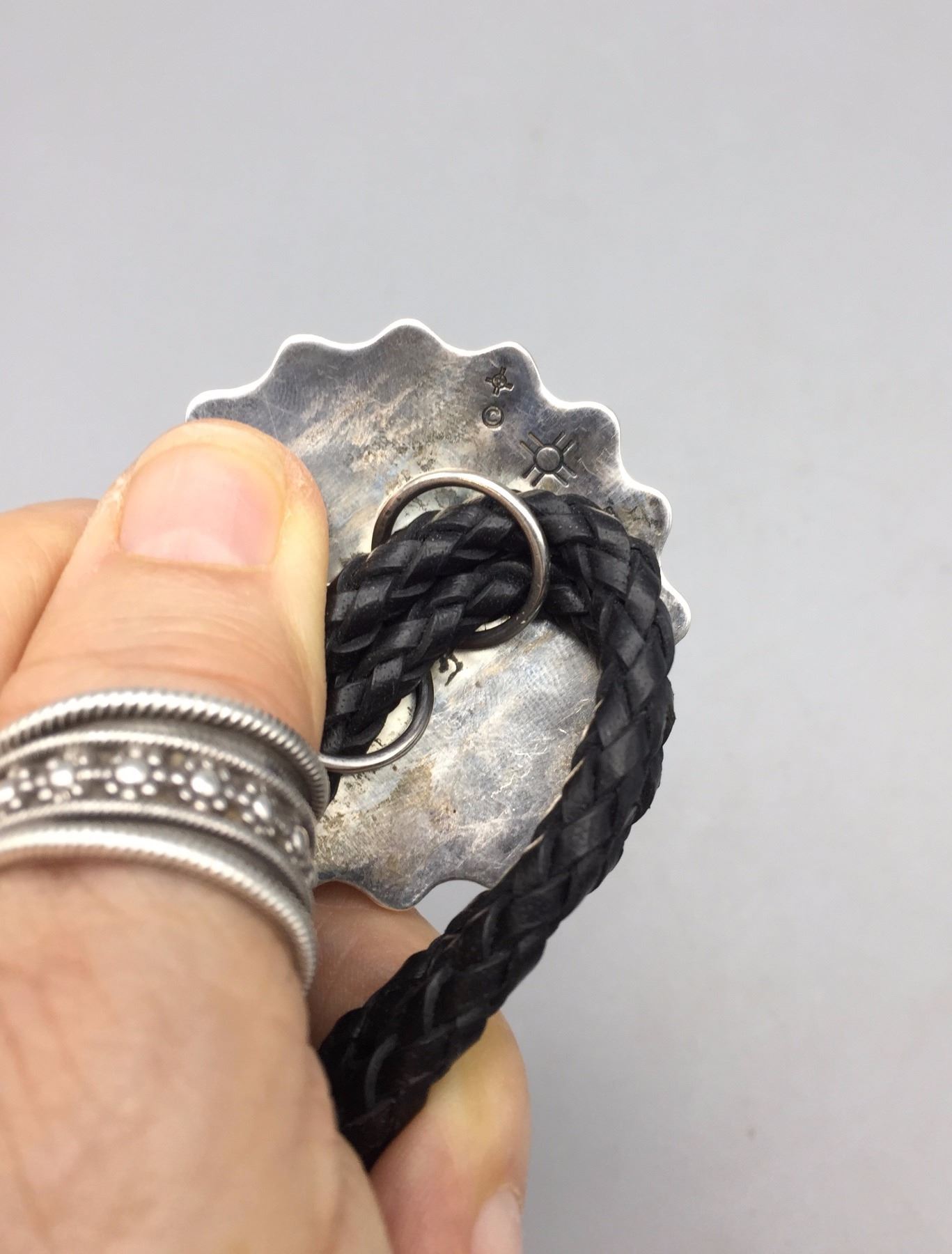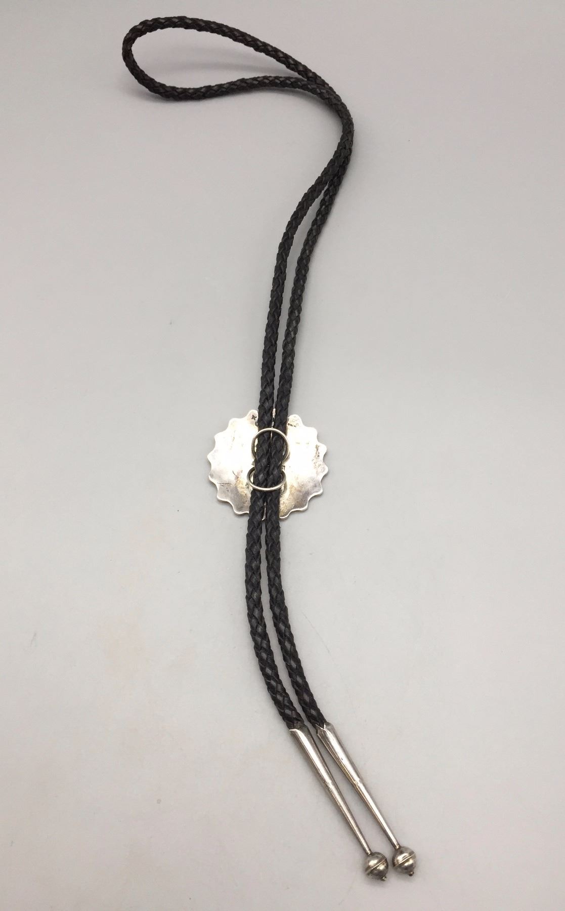 Description: Traditional Hopi designed bolo by Milson Taylor. Maker: Hallmarked with the mark of Milson Taylor, Hopi. Approx. Age: Circa 1980s - 90s. Size: Slide is approx. 1 7/8“. It's on a 40" braided leather cord with sterling tips. Weighs 47.9 grams. Condition: Good for its age, normal wear expected. Please look closely at the pictures - they are an important part of our description. Shipping: There will be a $5 handling / packaging fee for shipping this lot. The actual cost of postage will be added on top of that.