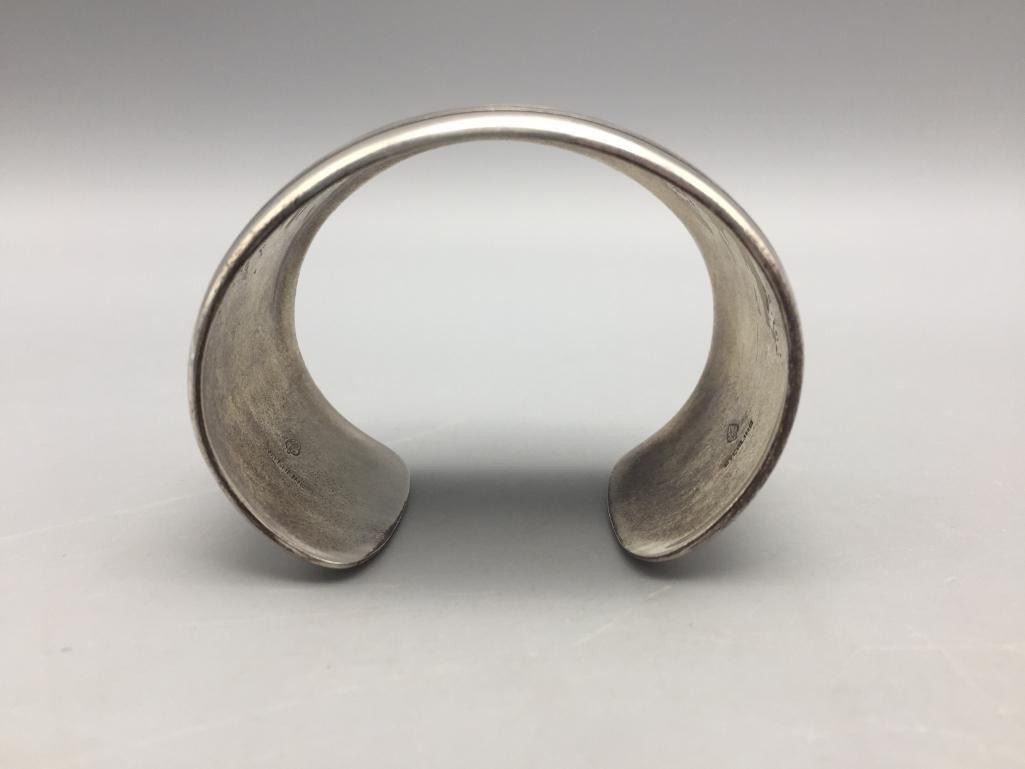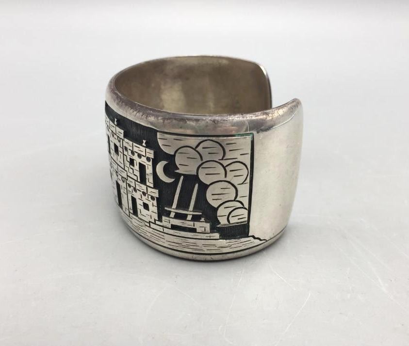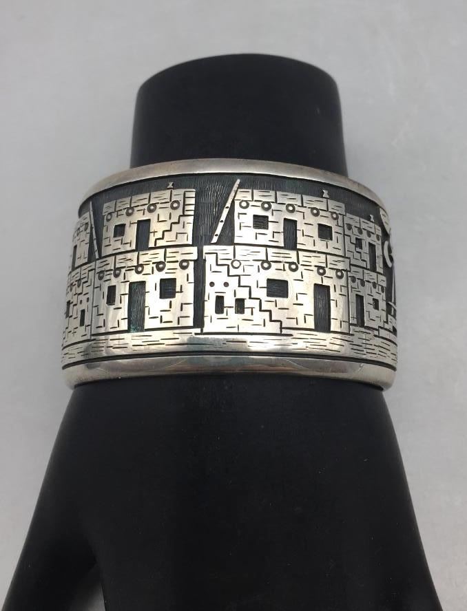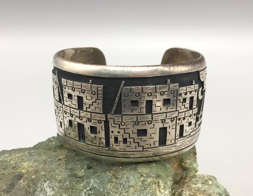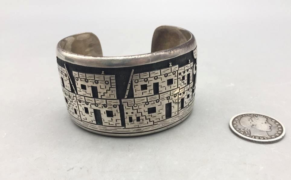 Description: Offered for sale in this lot is a Hopi overlay story teller bracelet by John Coochyumptewa. It features a neat pueblo scene. Marked sterling silver. Maker: John Coochyumptewa, (c.1950-Hopi) Active since 1970s.. Approx. Age: Circa 1980s. Size:Inside circumference measures 5-7/8 inches long. Opening is an additional 1 inch, fitting a 6-7/8 inch wrist. Width is 1-1/2 inches. Weighs 80.3 grams. Condition: Good for its age, normal wear expected. Please look closely at the pictures - they are an important part of our description. Shipping: There will be a $5 handling / packaging fee for shipping this lot. The actual cost of postage will be added on top of that.