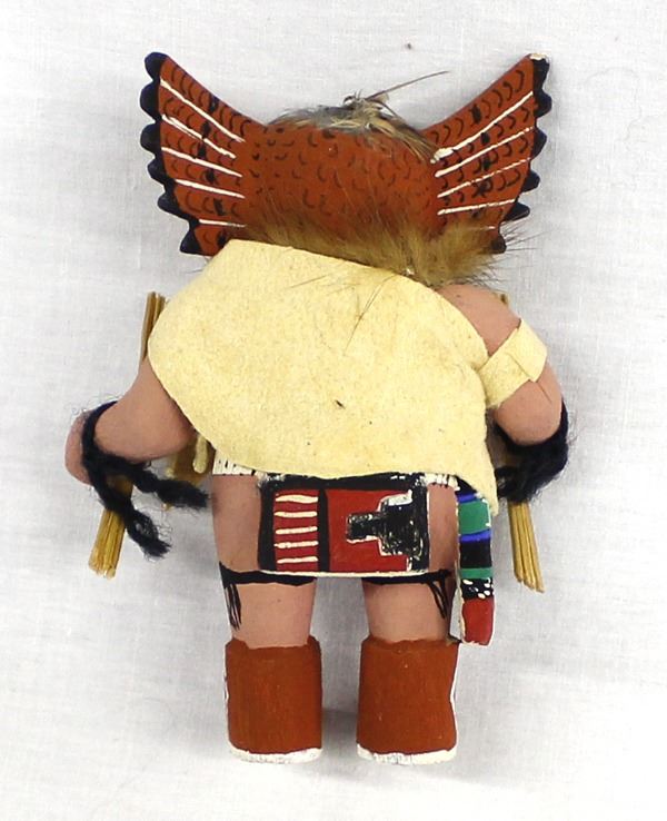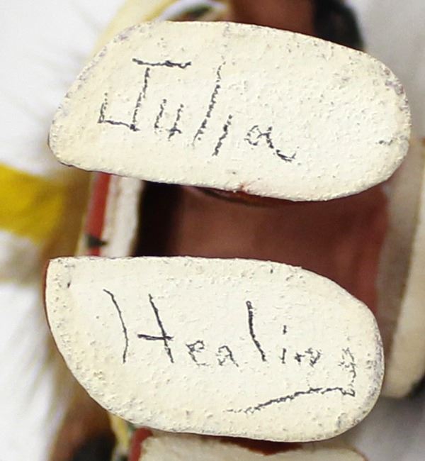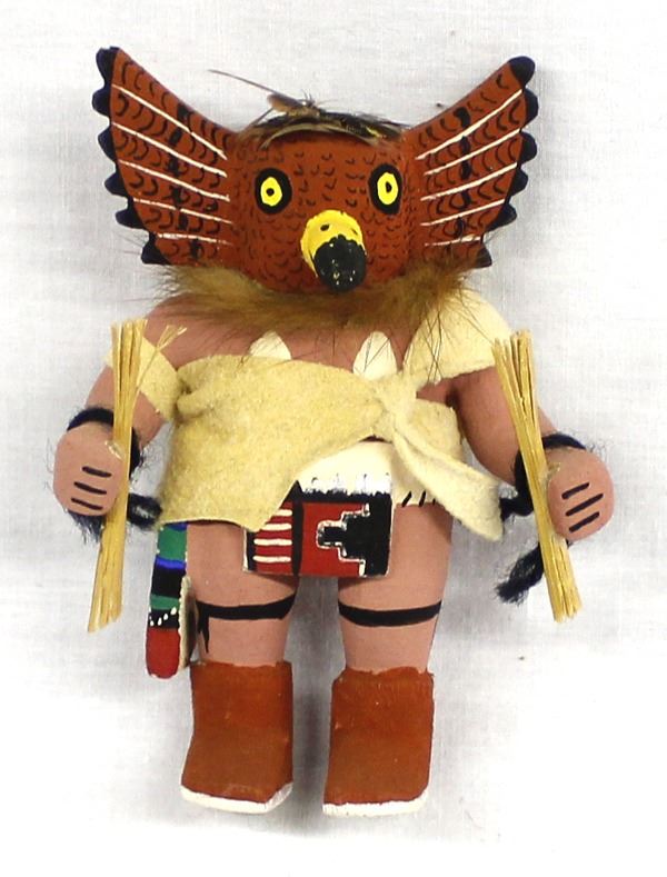 Native American Hopi Owl Kachina by Julia Healing, measures 3.5'' x 2.5'' x 1.5'' and is signed on the bottom, embellished with leather, yarn, fur, and feathers