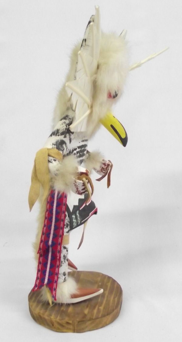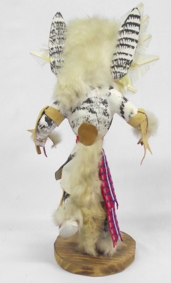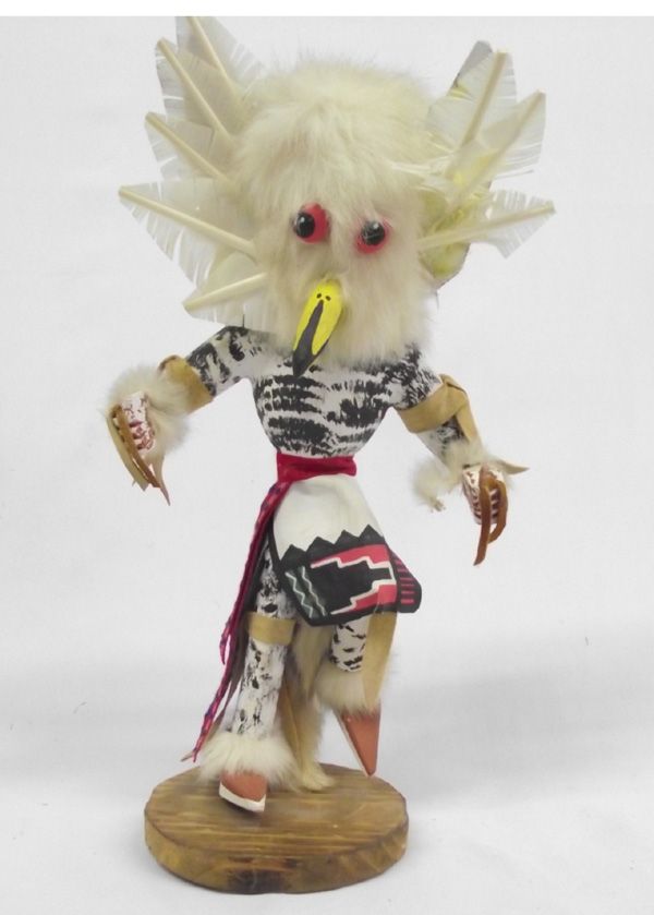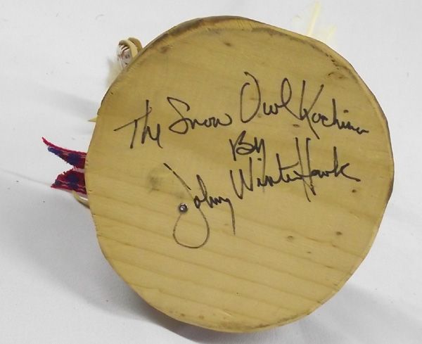 Hopi Owl Kachina. Also called Mongwa, he attends Pueblo dances to knock sense into kachina clowns. Standing 15.5''H x 8''W, his head feathers are coming loose and one hand is missing something. Signed on the bottom,''The Snow Owl Kachina by Johnny Winter Hawk.