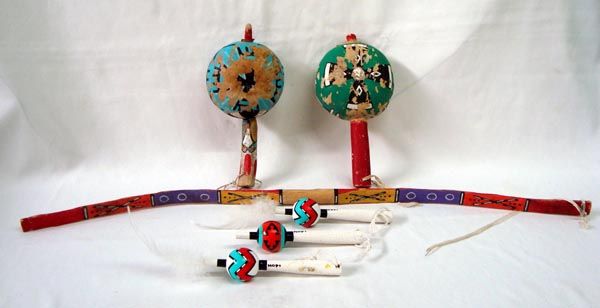 Native American Hopi Painted Dance Rattles and Bow. A dance bow painted red and with other painted designs on the inside. 2 gourd rattles, well used, each about 10'' long and 3 small rattles. The bow measures 31'' long.