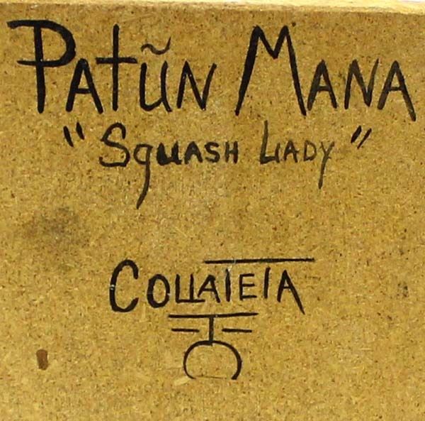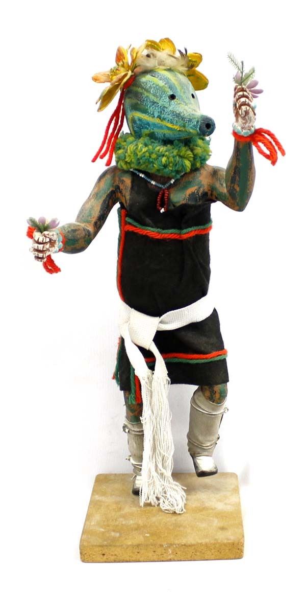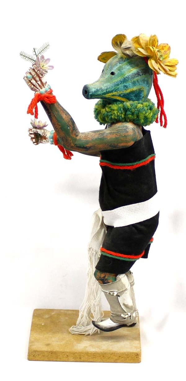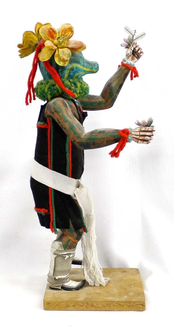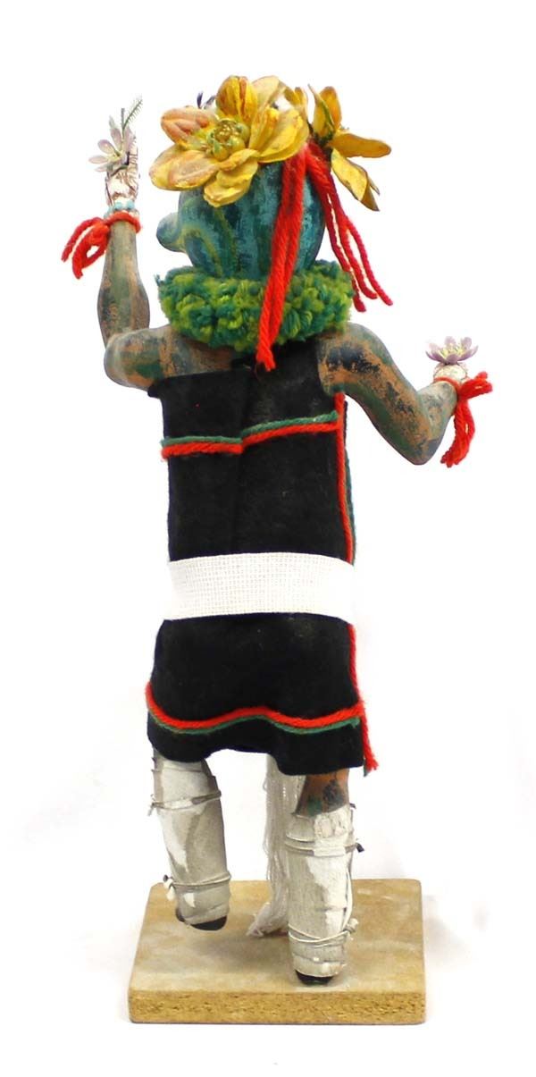 Native American Hopi Patun Mana ''Squash Lady'' Kachina by Thomas Collateta, Jr., he is half Hopi-Tewa, part Navajo and Jemez, member of the Sun clan and Eagle Clan, measures 7'' x 17'' x 6'' and is signed on the bottom, fabulous colors, embellished with artificial flowers, yarn, Hopi sash, felt, leather, beaded necklace, and feathers