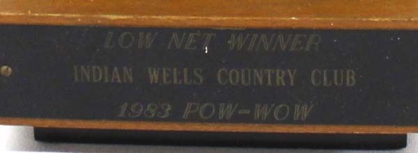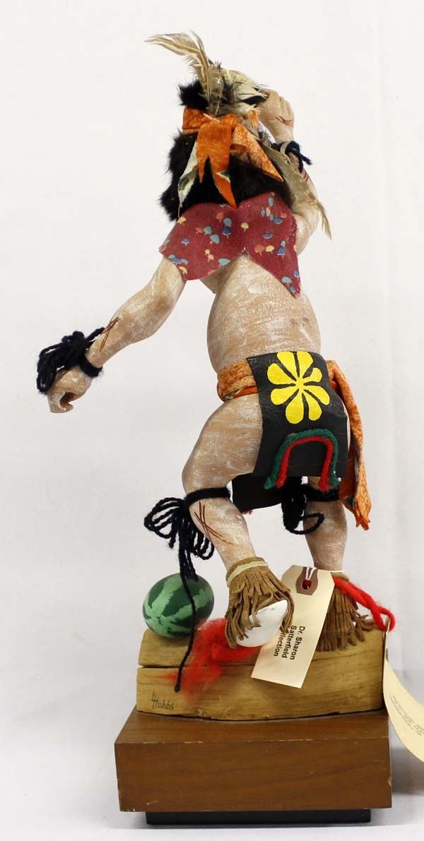 Native American Hopi Pipcuka Clown Kachina by Larry Hobbs, measures 17''H x 6'', glued onto a wooden trophy pedestal, plate in front reads ''Low Net Winner Indian Wells Country Club 1983 Pow-Wow'' (given as a trophy), embellished with cloth feathers, yarn, leather, and faux fur
