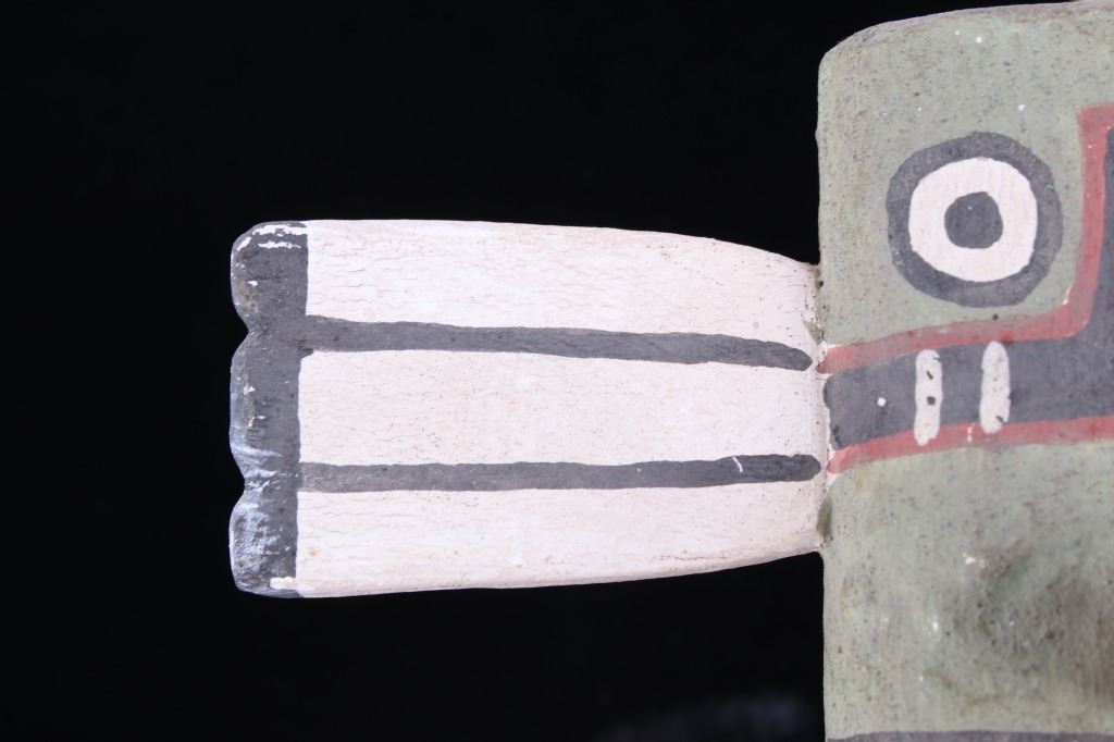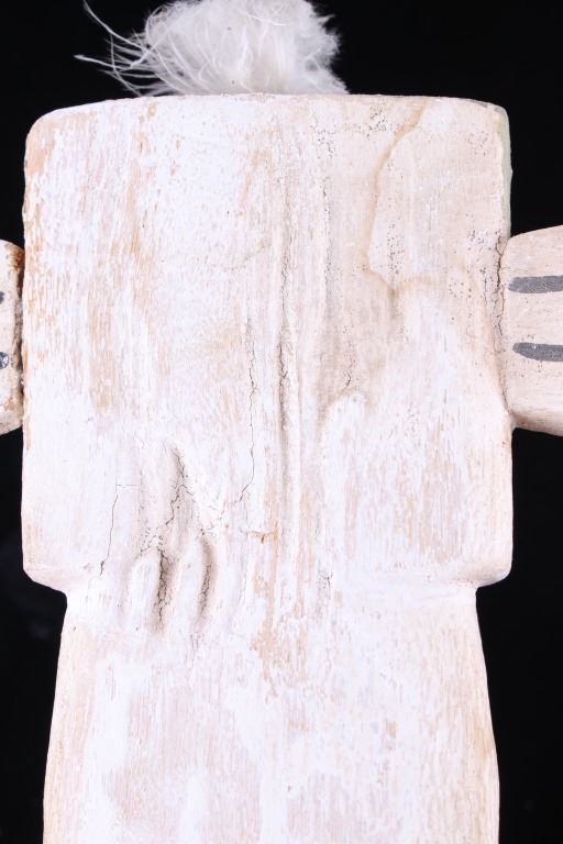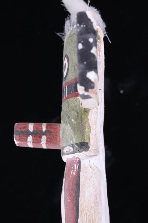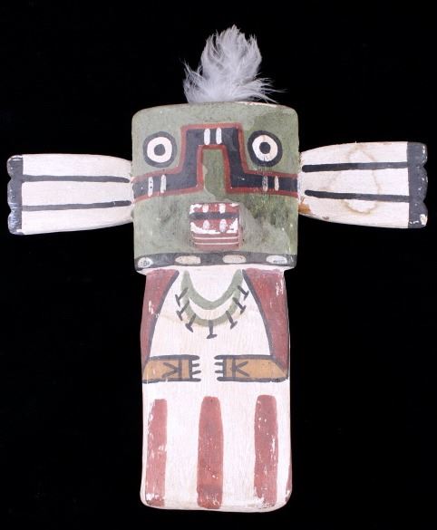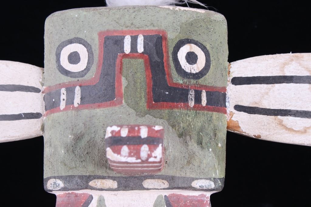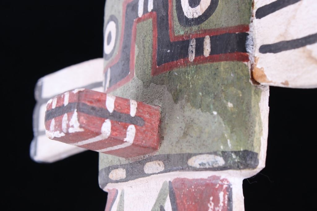This is a rare early polychrome painted cottonwood kachina hand carved from the Hopi Native American Indians and dating to circa early 1900. The piece shows a flat design with wide winged pattern at the ears and overall shows a pigment mineral polychrome painted red, black, white, green and yellow. The figure shows a two-strand necklace with seven blossom beads. The top of the curved face flat back kachina shows a feather. The piece is in very good well-preserved condition with a repaired wing. Measures overall 9”x8”x3”. Provenance: From a 90-year collection out of Central Arizona in the Coconino National Forest.