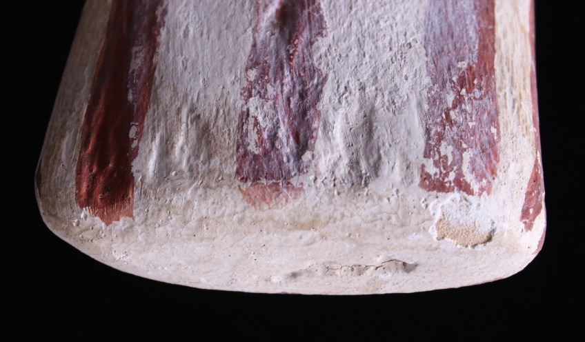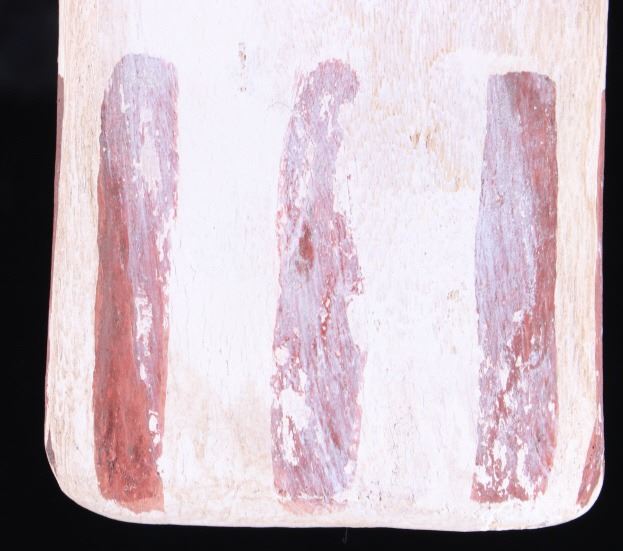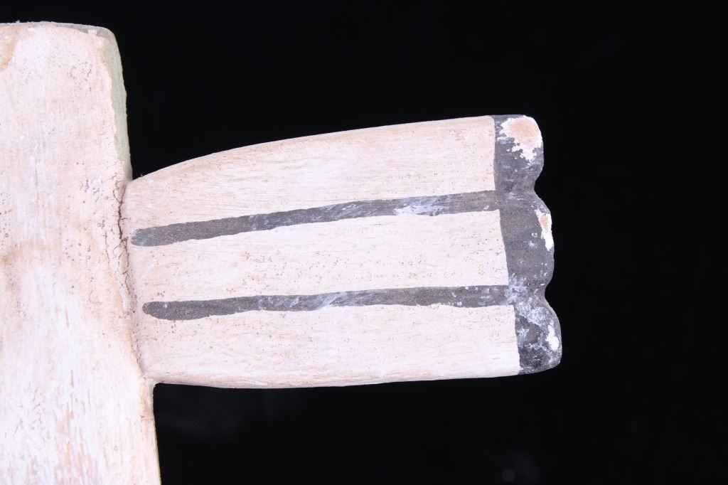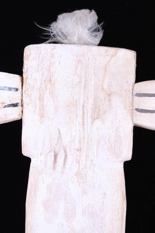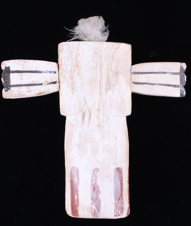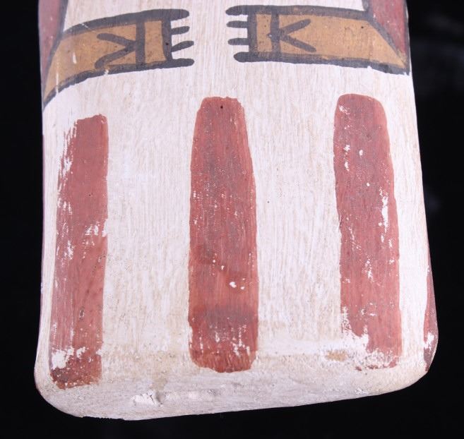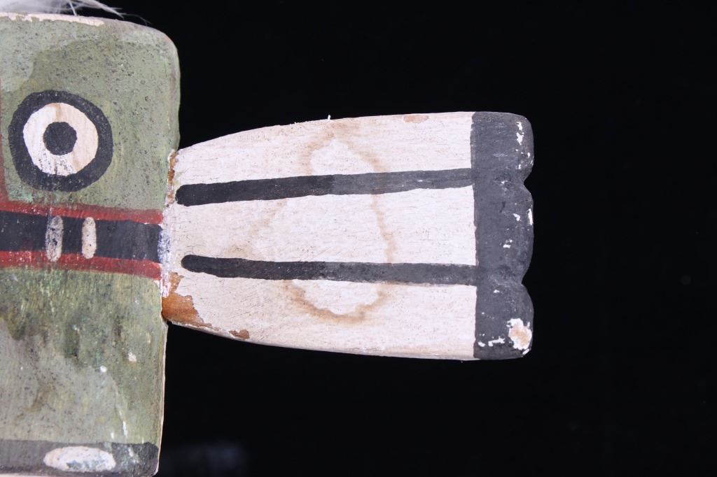 This is a rare early polychrome painted cottonwood kachina hand carved from the Hopi Native American Indians and dating to circa early 1900. The piece shows a flat design with wide winged pattern at the ears and overall shows a pigment mineral polychrome painted red, black, white, green and yellow. The figure shows a two-strand necklace with seven blossom beads. The top of the curved face flat back kachina shows a feather. The piece is in very good well-preserved condition with a repaired wing. Measures overall 9”x8”x3”. Provenance: From a 90-year collection out of Central Arizona in the Coconino National Forest.