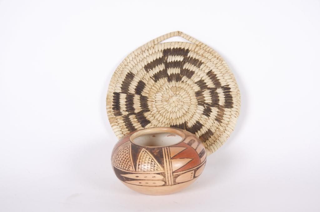 Hopi Polychrome Pot and Papago Basketry TrayThe pot has a traditional geometric design that is signed on base "Violet Huma", measures 4 1/2"dia x 3"H, good condition with minor age wear to finish, otherwise very good; the tray is tradition round design with square geometrics with small handle on 1 end, measures 6 1/2"dia. Condition: Overall very good with minor loss to the rim.