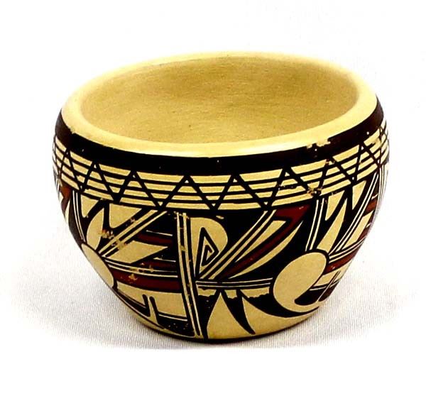Native American Hopi Polychrome Pottery Bowl by Jofern Silas Puffer, measures 3'' x 4'' and is signed on the bottom, FYI: ''Jofern Puffer is part of the Tewa/Laguna, Kachina Clan; active 1990-present: polychrome seed jars.''