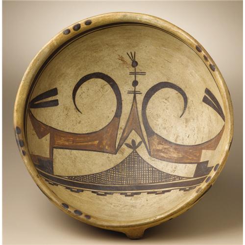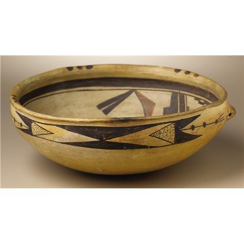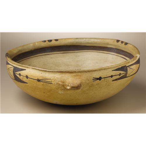 <B>Hopi Polychrome Pottery Bowl</B></I><BR>Circa 1920<BR>Height 4 in. Diameter 9 1/2 in.<BR><BR>This bowl is characterized by its rounded base, everted rim, and a pierced suspension knob. The interior is painted with highly stylized bird motifs including curving beaks and red and black feathers, solid and hatched, against the cream slip. A thick black band frames the design just below the rim. The exterior is further decorated with bird designs.<BR><BR>Provenance<BR>Bonhams and Butterfields, Sale 7477E, Lot 3354, December 8, 2003.<BR><BR> <BR><BR><B>Important notice: