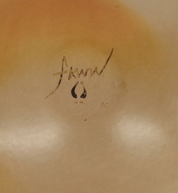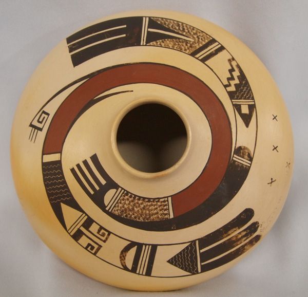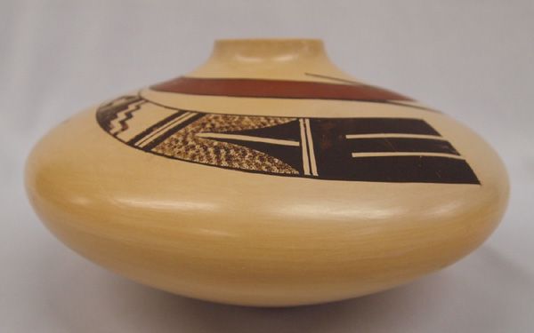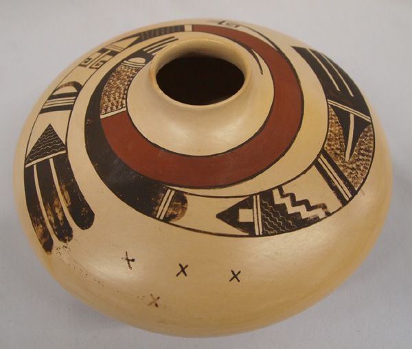 Hopi Polychrome Jar - Signed by Fawn Navasie. Feather design wraps around the top. 4''H x 8'' diameter. Beautiful jar for your collection.