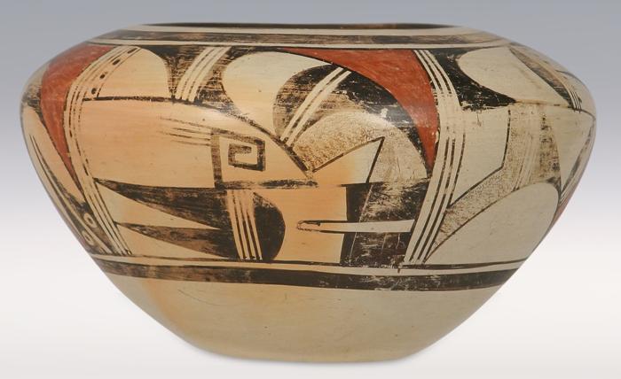 Hopi Pot. 5" x 9". Black and red on white slip. Made by Paqua Naha (1890?-1955), first Frog Woman. Active 1910-1955. Frog hallmark on bottom. Condition Report: Sound condition but numerous areas show wear from use.