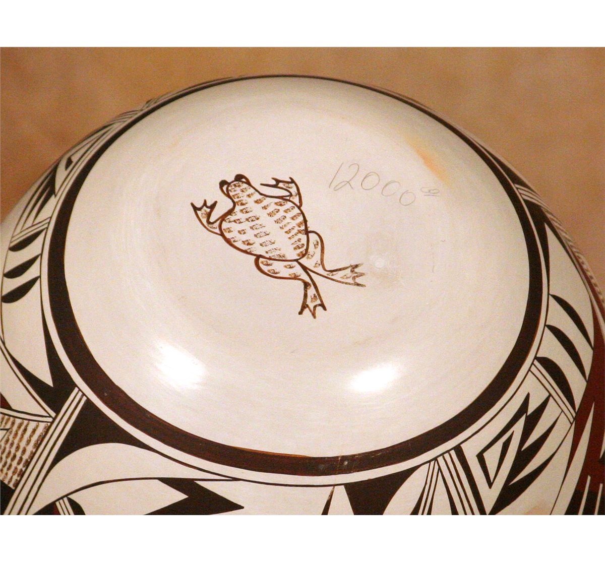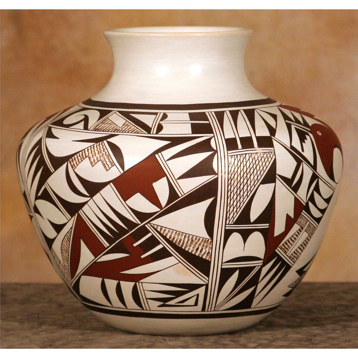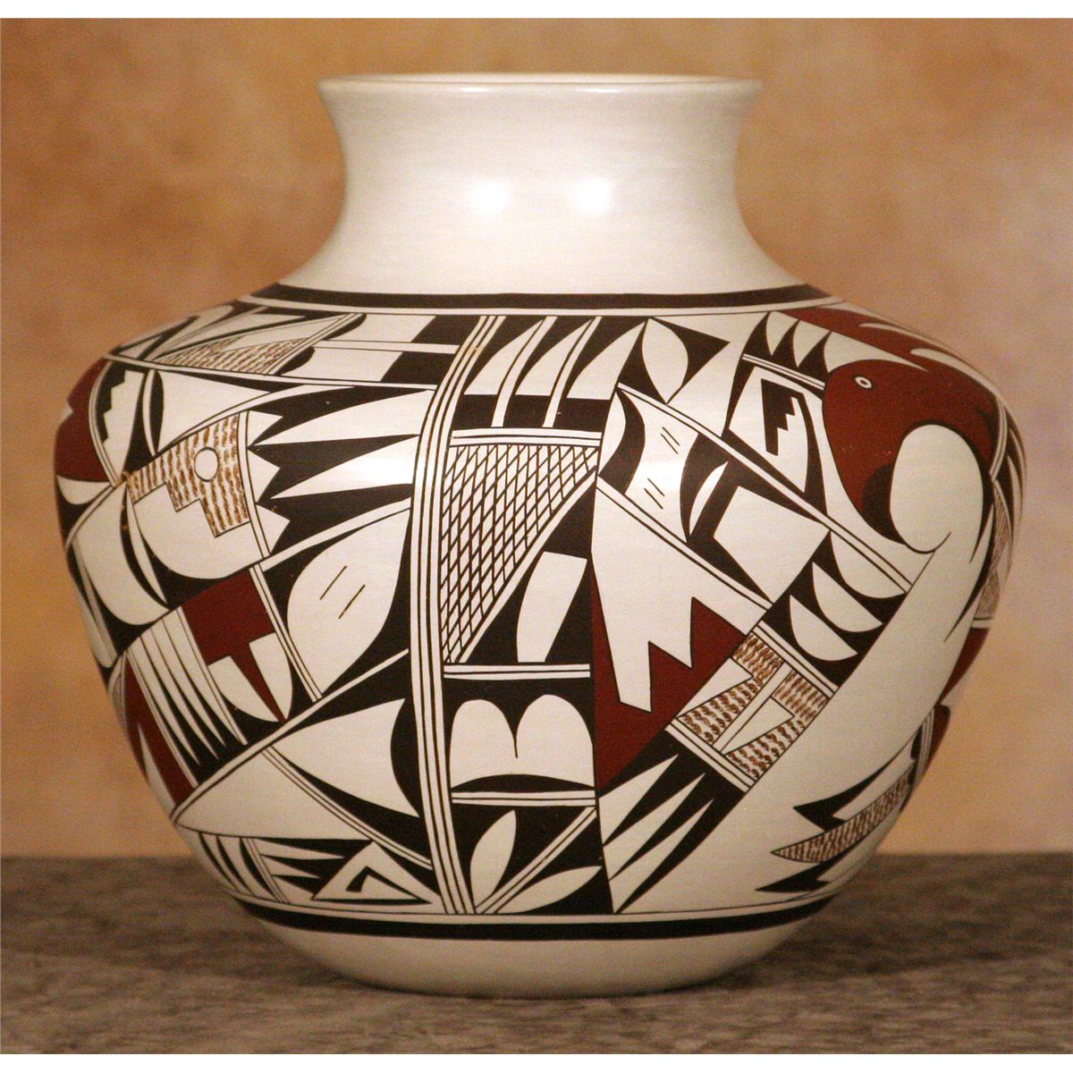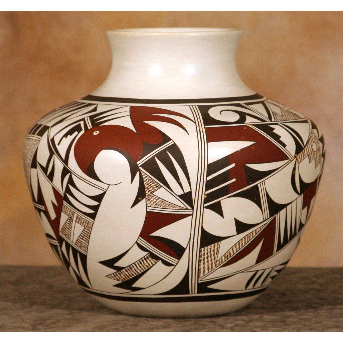 Hopi Pot by Frog Woman Second Joy Navasie (1919 - 2012). 10.25" x 11.5". Large pot decorated with stylized birds and feathers. Classic red and black over a white slip.
