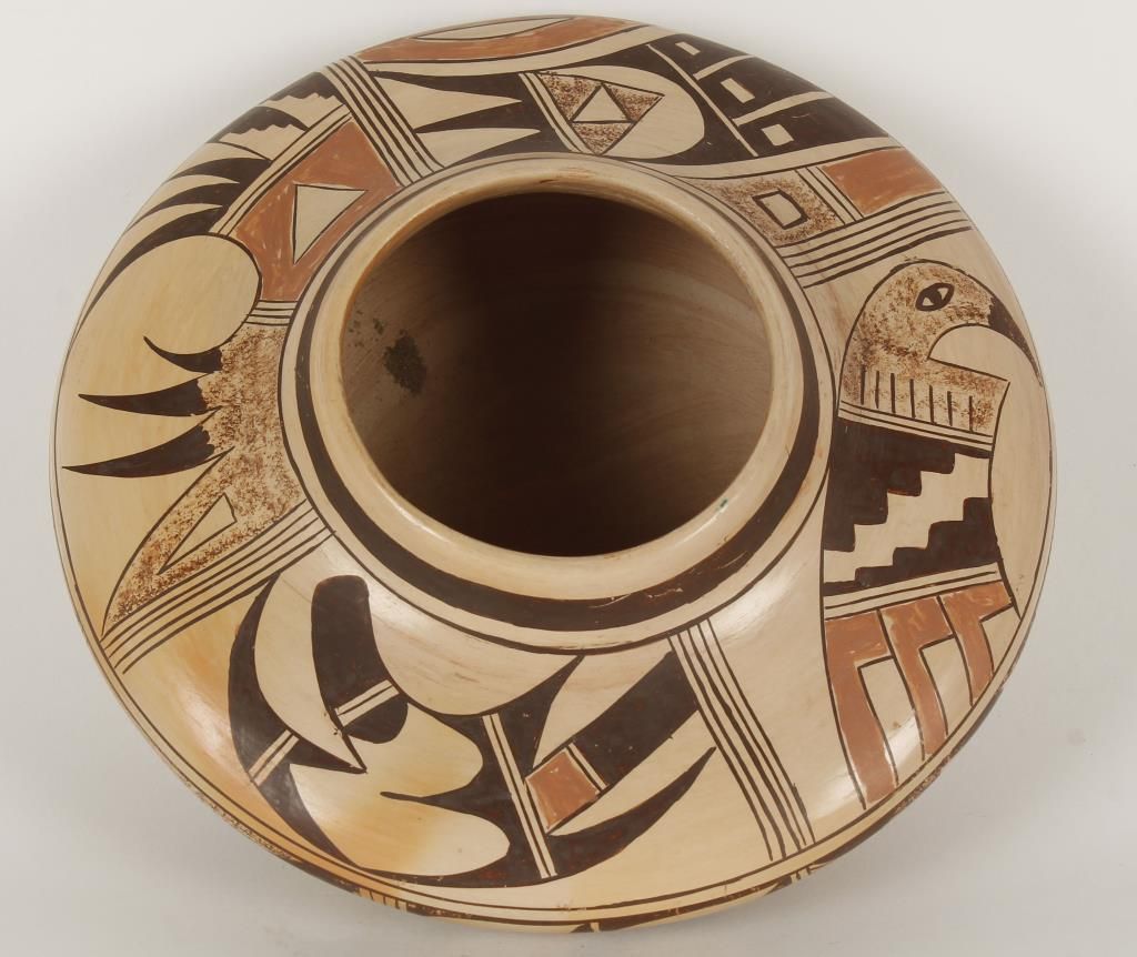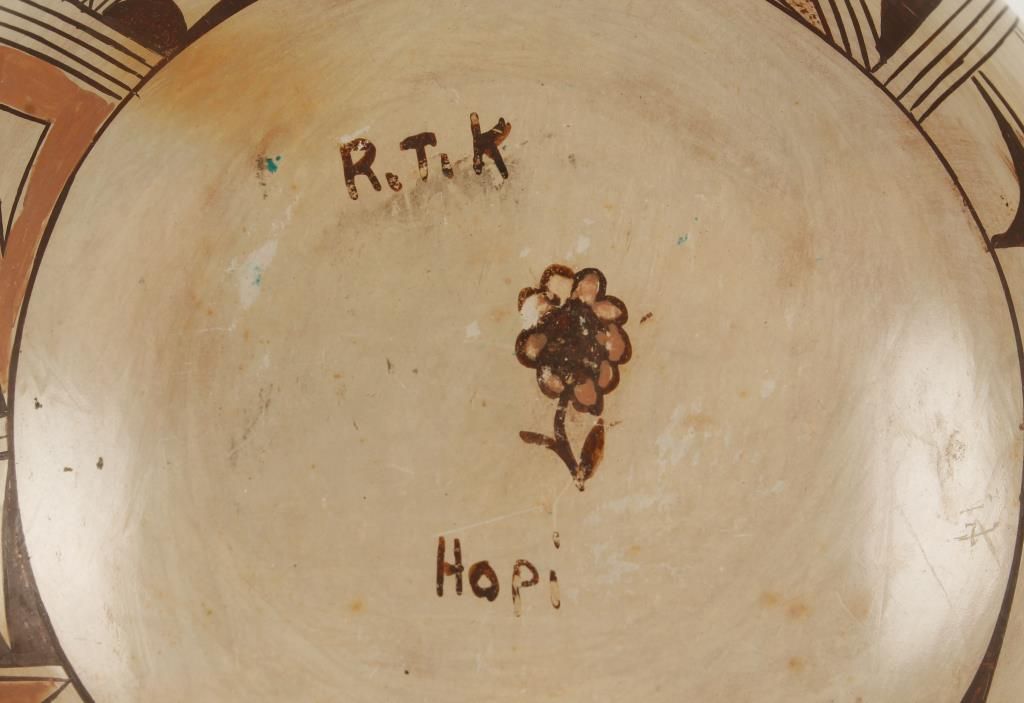Circa 1950's. Geometric and bird design. 3" high x 7-3/4" diameter. Signed "R.T.K." and "Hopi", with painted flower on base.