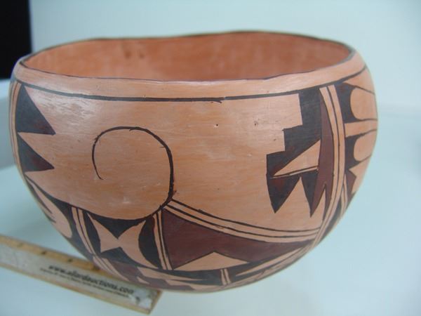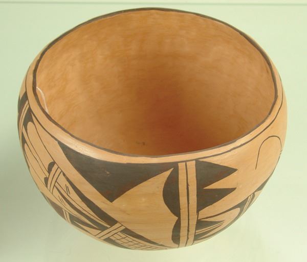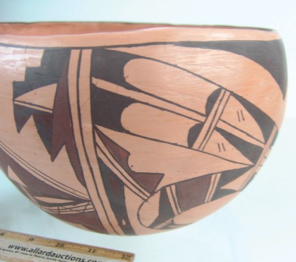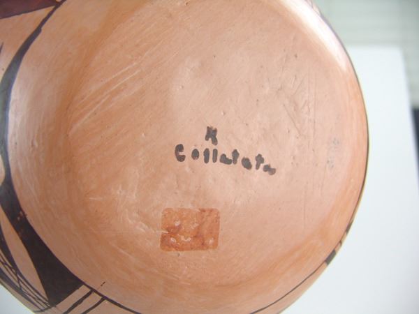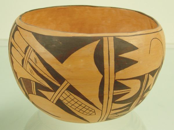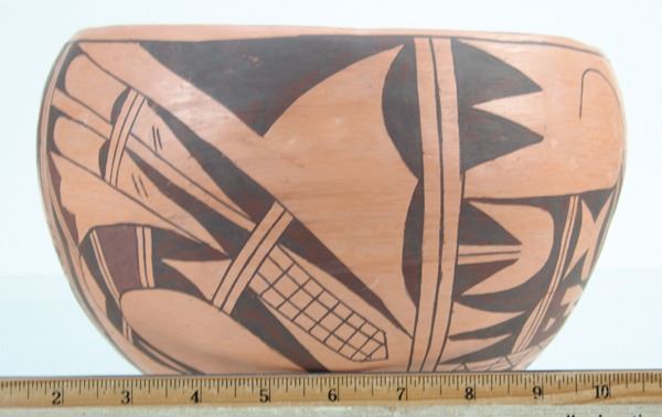 Large, globular, polychrome-on-yellow bowl with traditional avian inspired motif, possibly one of her earlier works. Good condition.Ca. 1970s-1980s6-1/2" x 9-1/2"