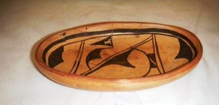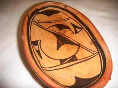 Hopi Pottery Bowl, this oval bowl is circa 1940 and is 4 inches x 7 inches. There is a piece broken and has been glued back together. Shipping $18.00