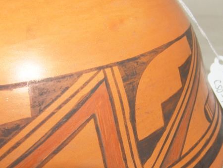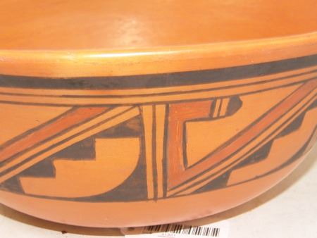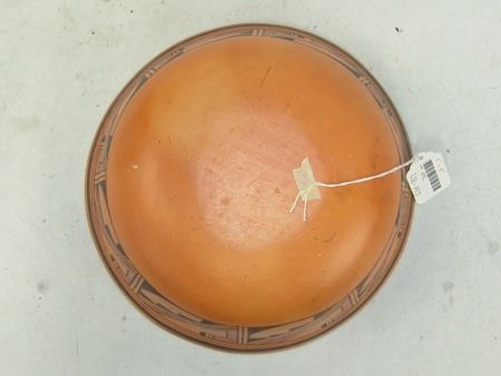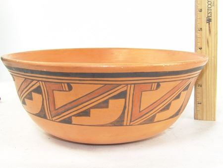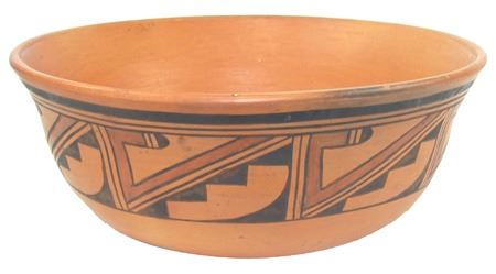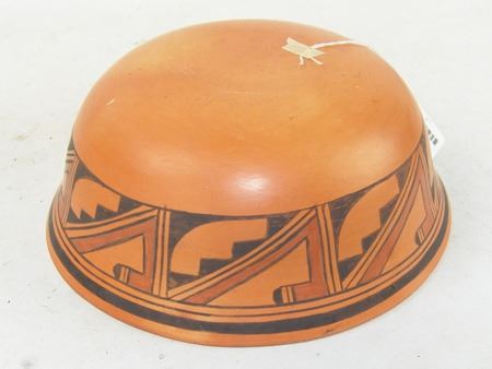 Ca. 1970s-1980s, Beautiful red slip flared "helmet" bowl with traditional exterior design band with avian theme. Very good condition, has pin chip in rim. 4" x 10"