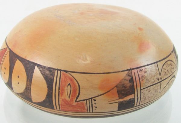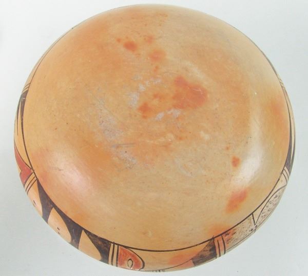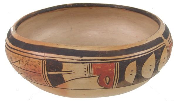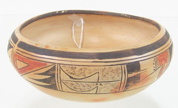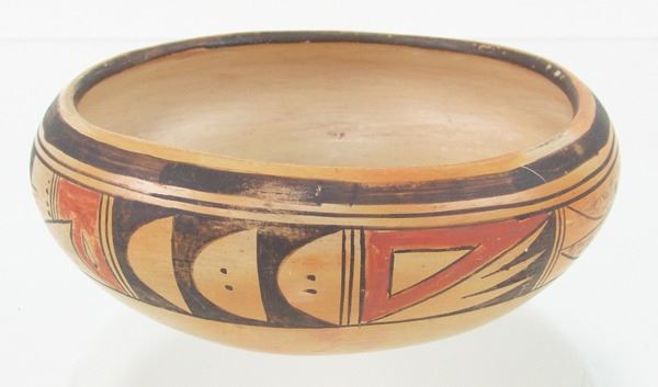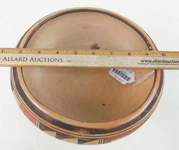Wonderful,classic design polychrome pottery bowl done in a low profile with traditional avian inspired motif. Very good condition, minor scuffs. A nice early example.Early/Mid 1900s3-1/2" x 9"