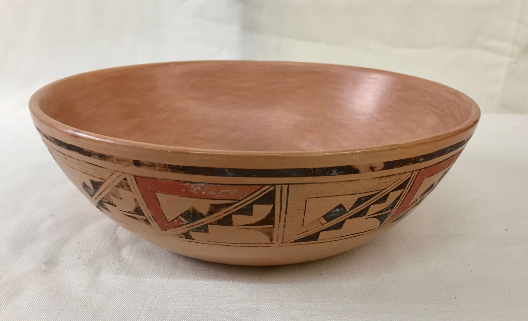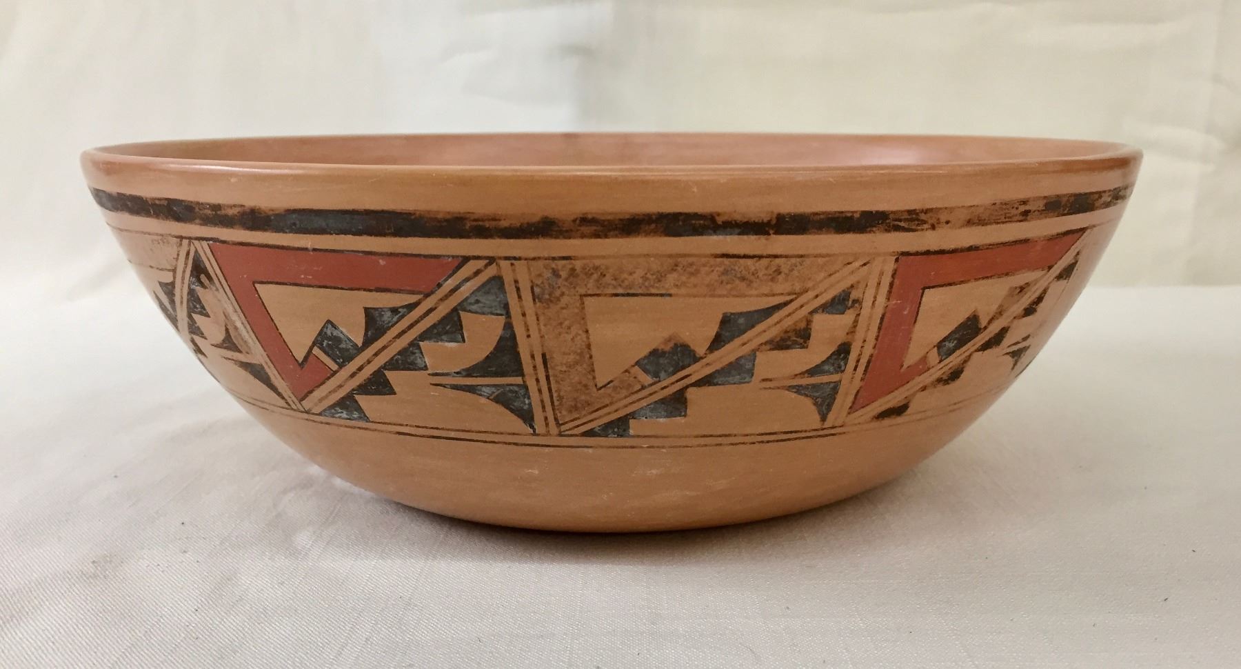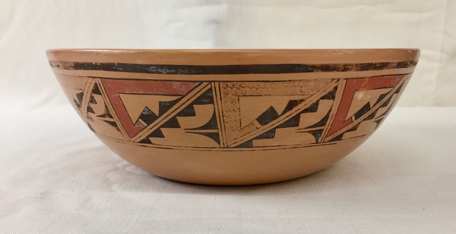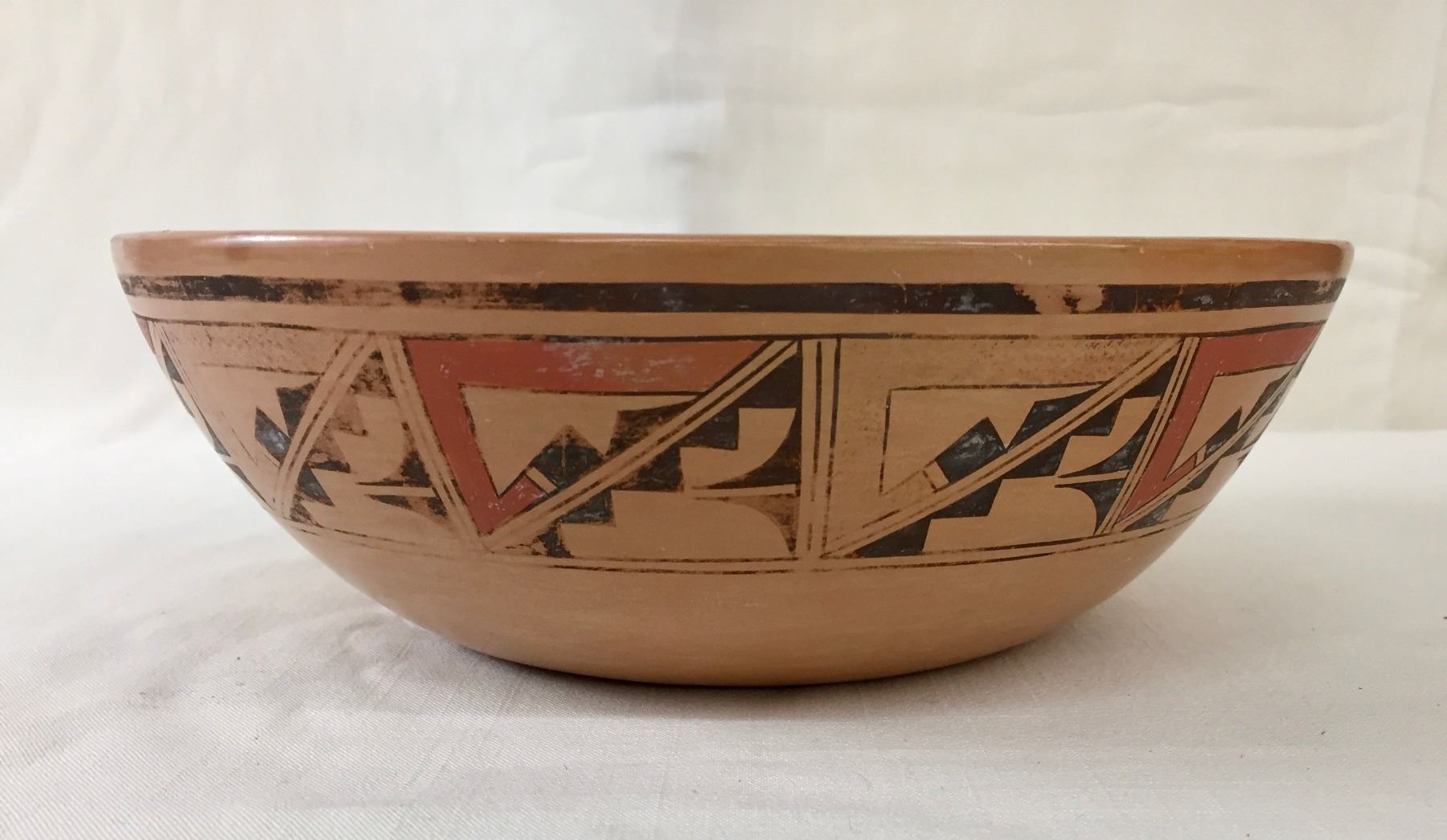 Description: Featured for sale in this lot is a Hopi pottery bowl with geometric hand painted designs. This is a handmade pot. Maker: Unknown Hopi potter. Approx. Age: Vintage. Size: 9-1/2”w x 3-1/8” deep. Condition: Good for its age, normal wear expected. Please look closely at the pictures - they are an important part of our description. Shipping: There will be a $10 handling / packaging fee for shipping this lot. The actual cost of postage will be added on top of that.