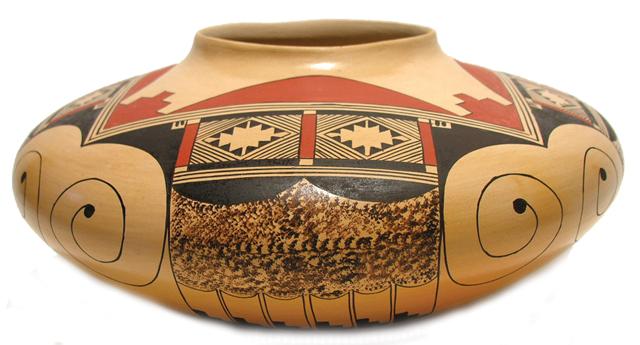 Late 1900s, Clinton Nampeyo, Large disc-shaped polychrome pottery bowl with classic bird and geometric motif - from Polacca; pristine condition. 6" x 13"