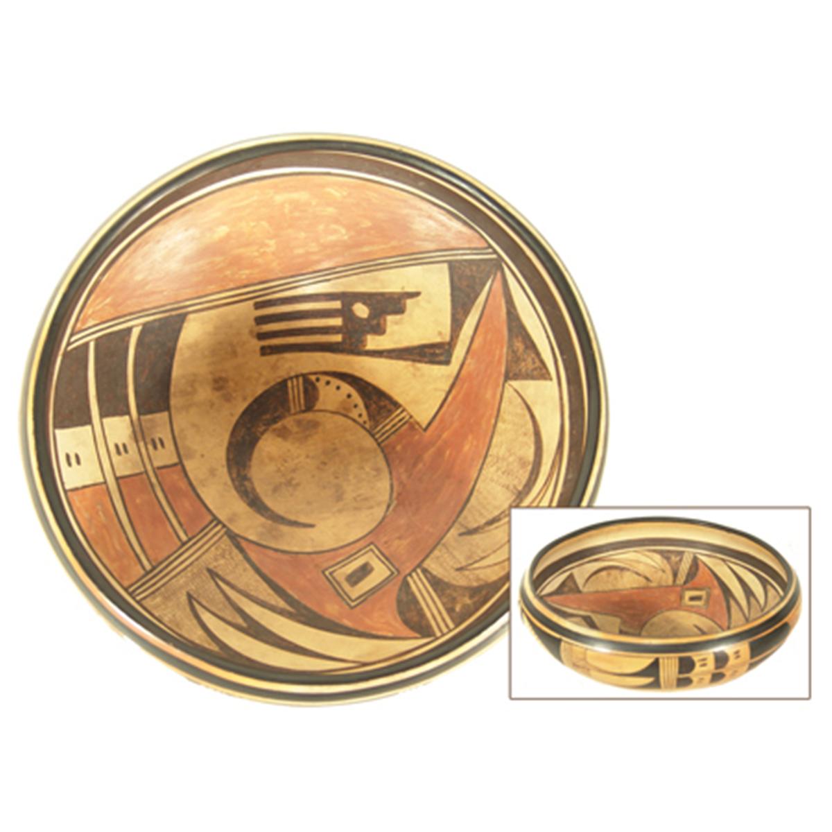 Large, outstanding wide bowl with bird design on the inside and a band of wing symbols on the exterior. The owner attributes it to Nampeyo. Condition: very good. 5" x 13"