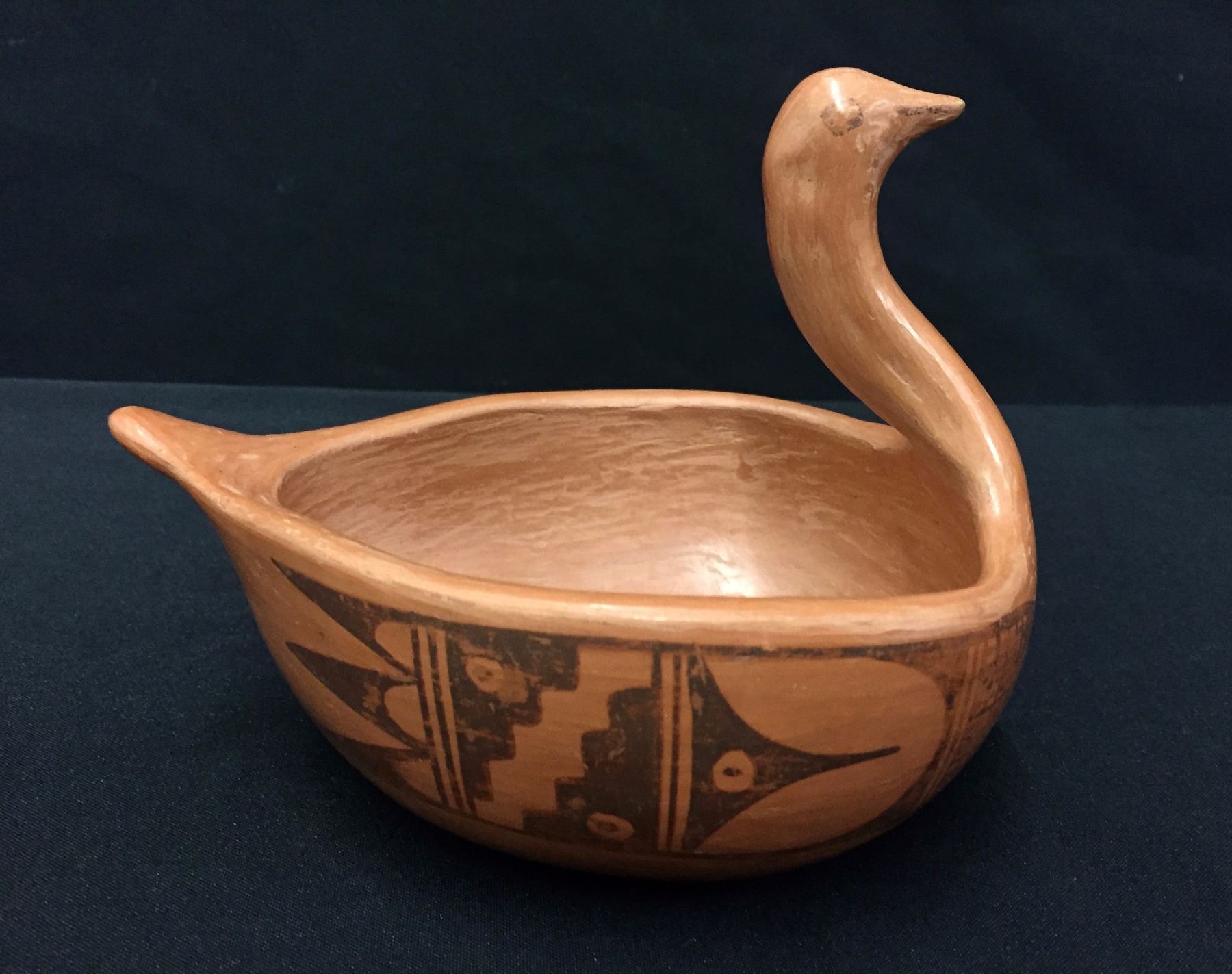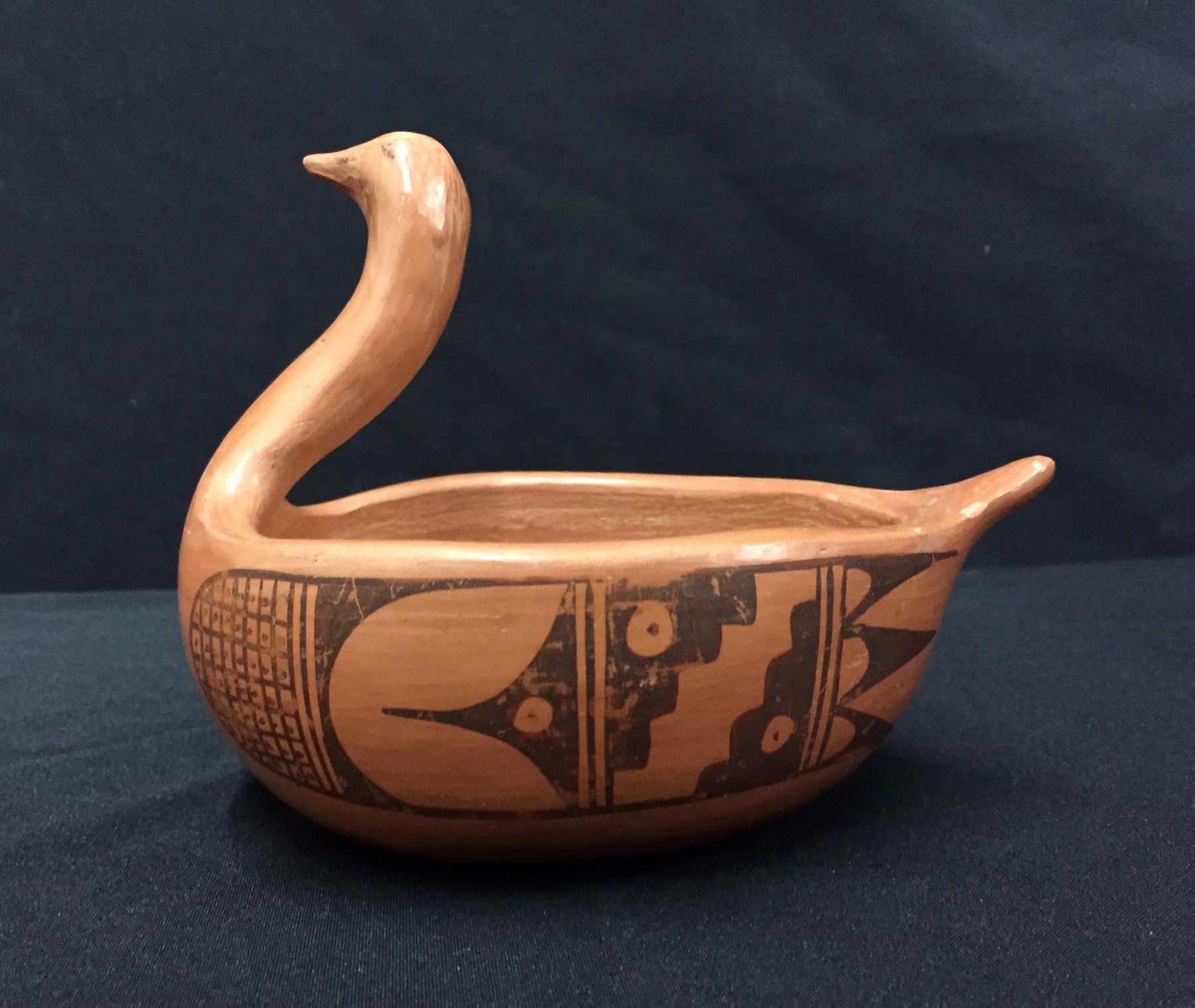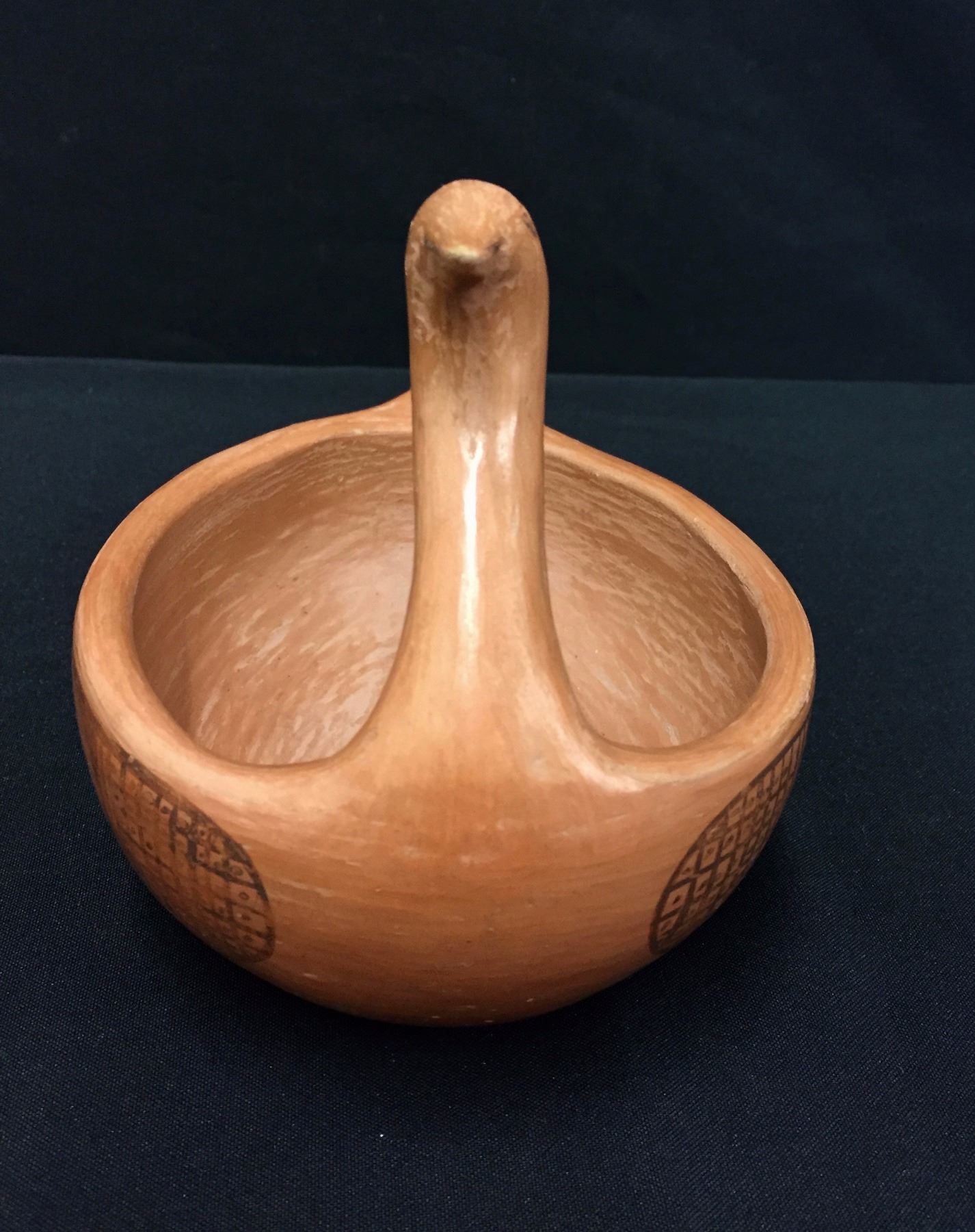 Maker: Unknown artist. Approx. Age: Circa 1970s. Size: Measures approx. 6 1/2” at it’s widest point and about 5 1/2” tall. Condition: Good for its age normal wear expected. Additional Info: Handmade, Hopi Pottery Effigy. Please look closely at the pictures - they are an important part of our description. Shipping: There will be a $8 handling / packaging fee for shipping this lot. The actual cost of postage will be added on top of that.