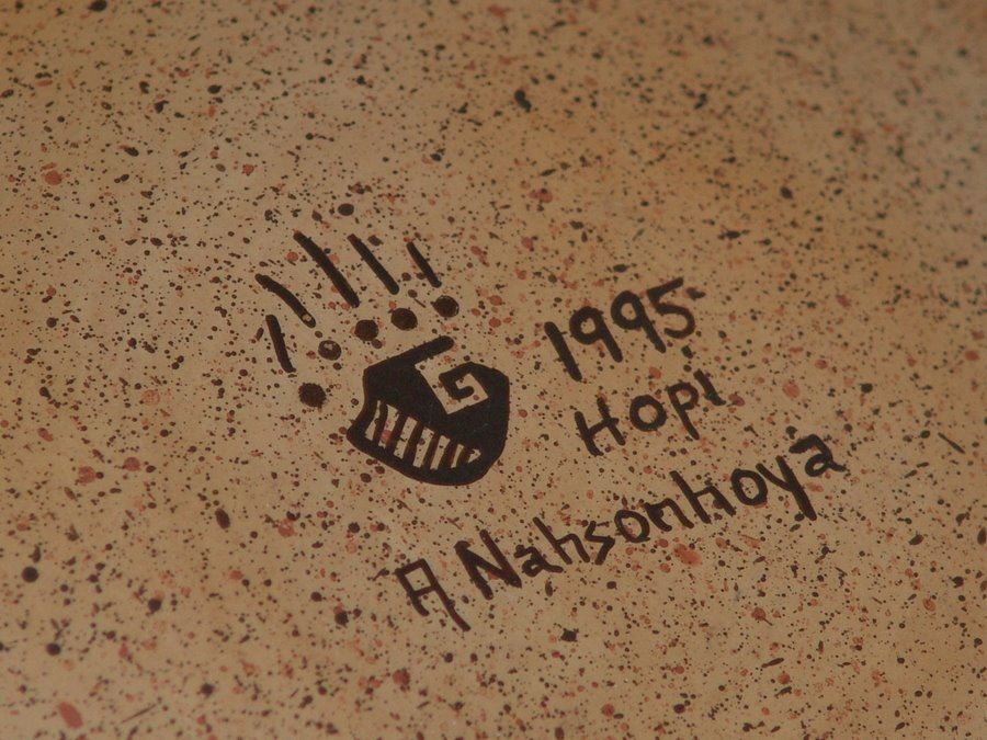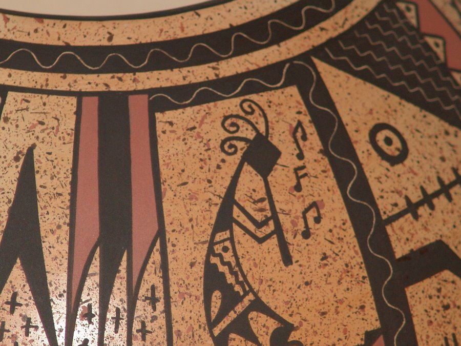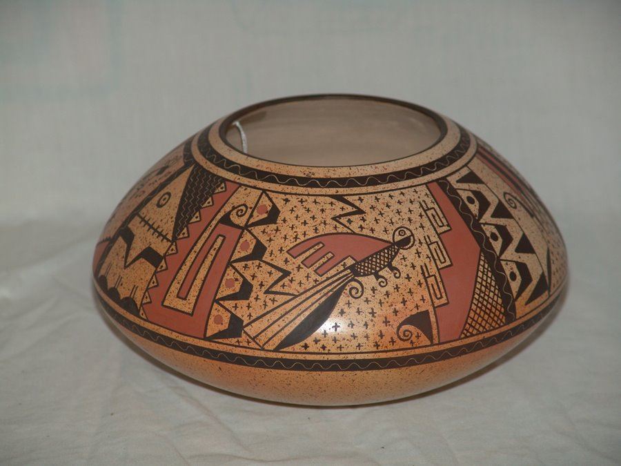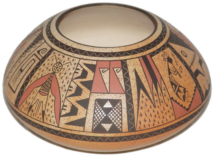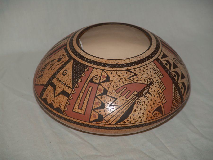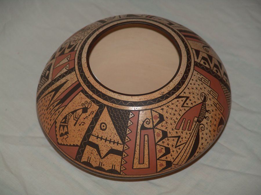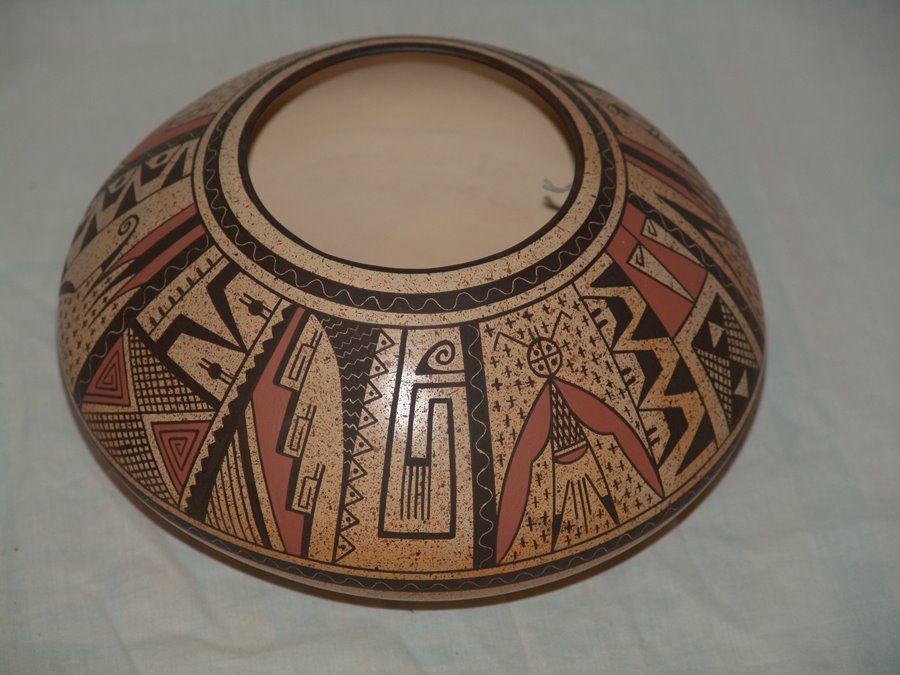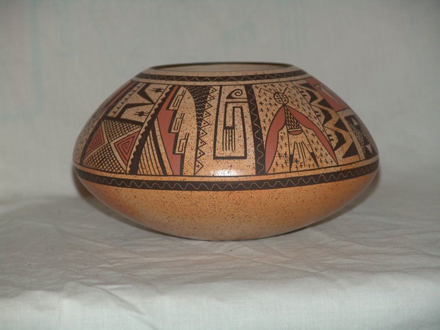 Very fine polychrome jar with interesting original and more contemporary motifs. Very good condition.,Late 1900s,5-1/2" x 9-1/2"