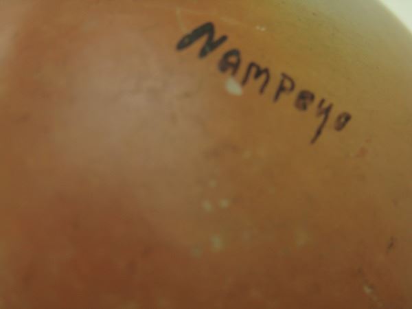 Early/Mid 1900s 4" x 8" Classic shaped jar/bowl with traditional polychrome avian forms plus corn symbols. Very good condition. With minor surface scratches.