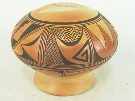 Mid/Late 1900s, Beautiful, uniquely shaped polychrome pottery jar with classic avian motif. Very good condition, with some scuffs. 6" x 7-1/2"