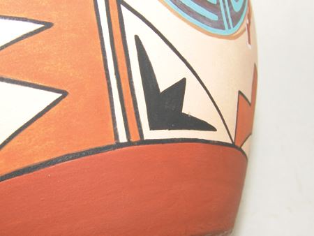 Ca. 1992, Beautiful coiled pottery jar, the painted design showing several mudhead kachinas on an Avanyu serpent. Very good condition, with minor scratches. 6-1/2" x 7-1/2"