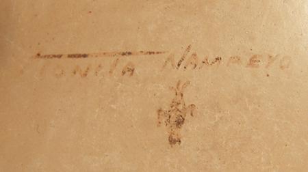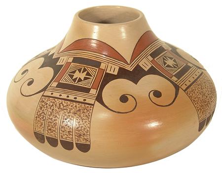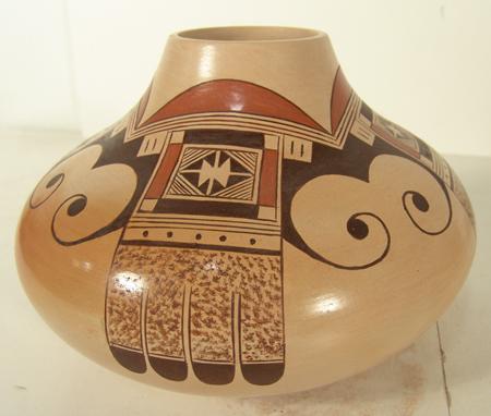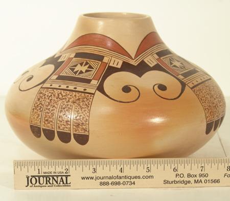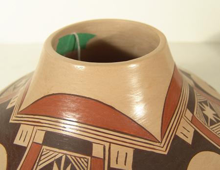 Outstanding wide based jar with an early Nampeyo polychrome design. Condition: excellent. 6-1/2" x 9-1/2"