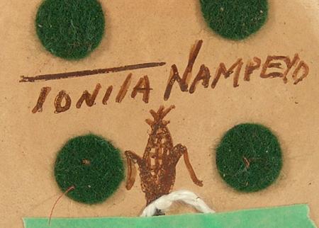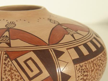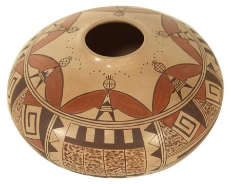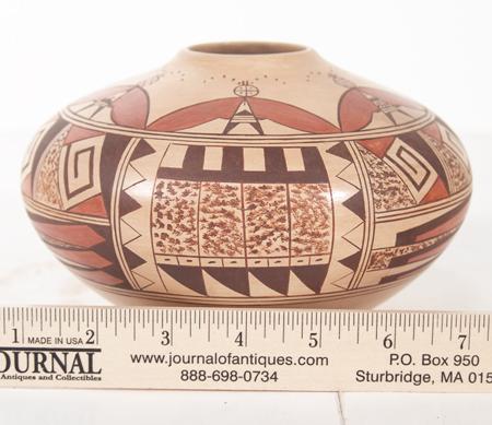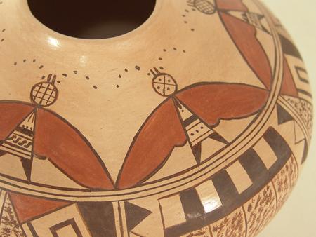 Very fine small mouthed jar with rare moth figures done in polychrome. Condition: excellent. 4-1/2" x 7"