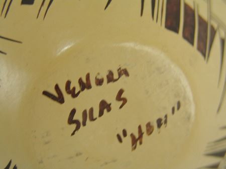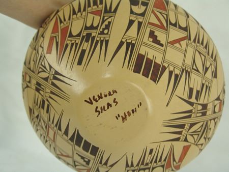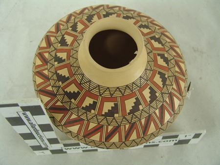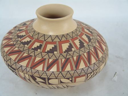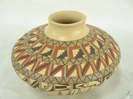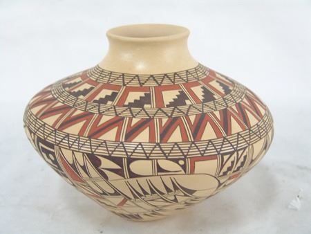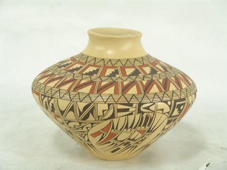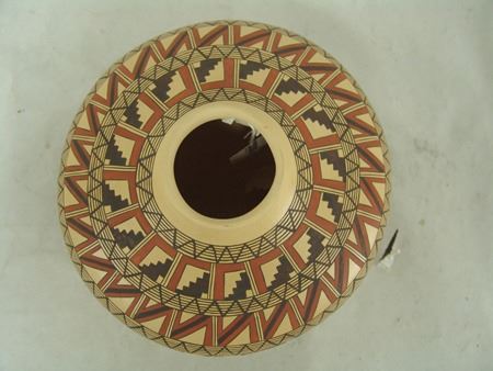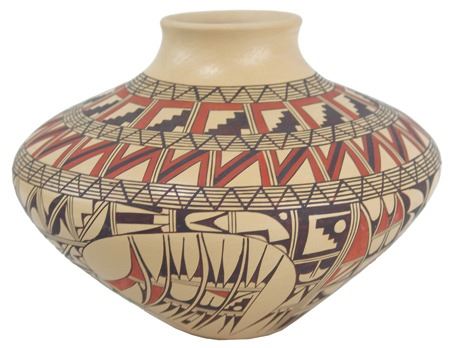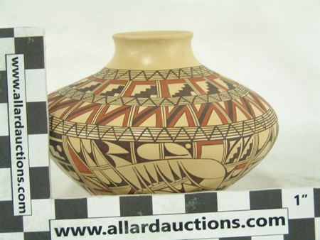 Late 1900s, Beautiful polychrome pottery olla with both mosaic and traditional avian design. Very good condition. 8" x 10"