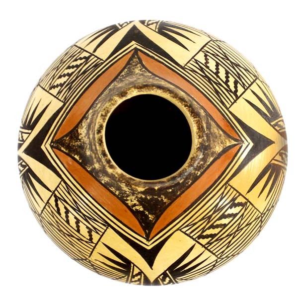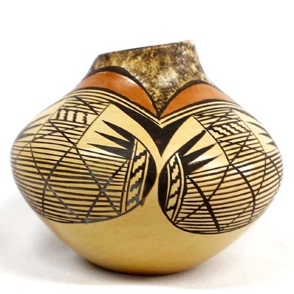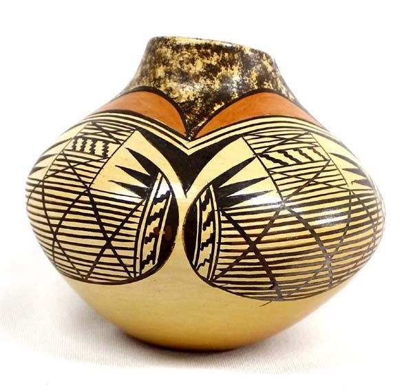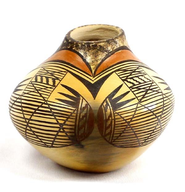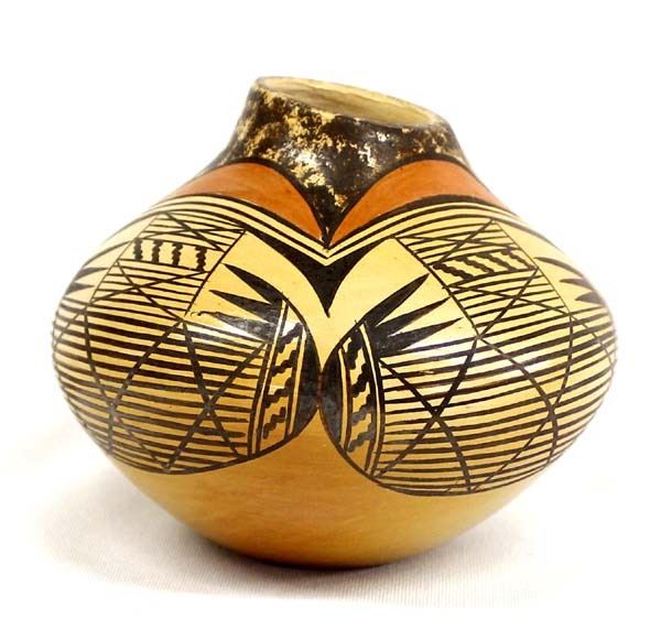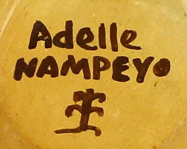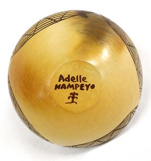 Native American Hopi Pottery Jar by Adelle Nampeyo, measures 3.5'' x 4'' and is signed on the bottom, FYI: ''Adelle Nampeyo is a member of the famous Nampeyo family. Her pots are hand coiled and painted in traditional methods and with Nampeyo designs. They are signed by Adelle along with her hallmark corn stalk. Adelle was born into the Hopi-Tewa Nation in 1959.''