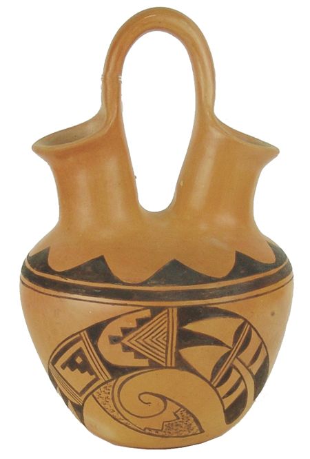 Ca. 1980s, Nicely shaped black-on-red double-necked wedding vase with traditional stylized avian motif. Very good condition, unsigned. 10-1/4" x 5-3/4" x 6-1/4"
