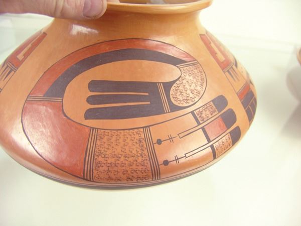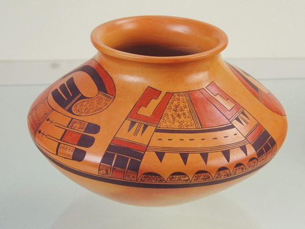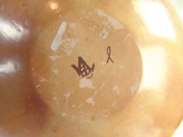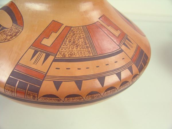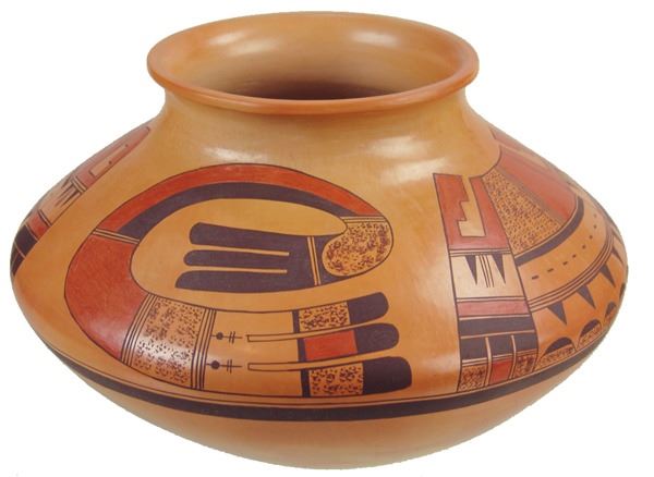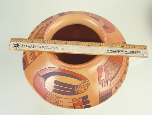Beautiful, traditional, polychrome-on-yellow pottery olla with large avian forms and other geometrics. Very good condition, signed with corn hallmark and "S".Late 1900s7" x 12"