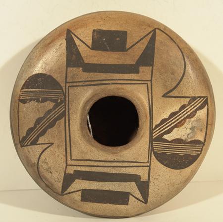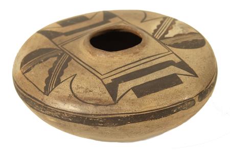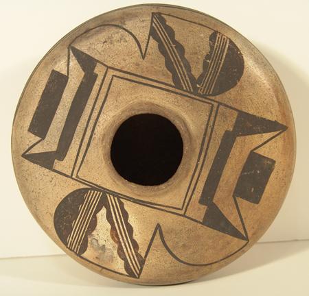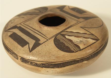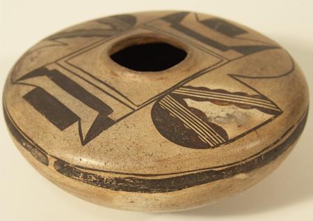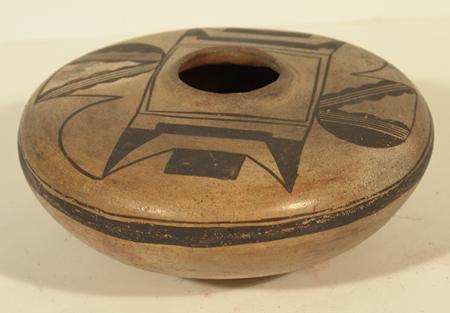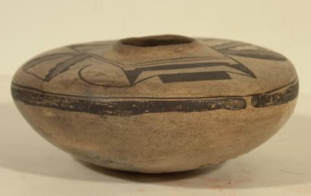Rare old wide polychrome jar with stylized feather pattern on the flat shoulder - Polacca, Arizona. Purchased Renaissance in 2001 for $3,500; appraisal value $2,500. Condition: good, crazed and cracked. 3-1/4" high x 7-1/4" diameter