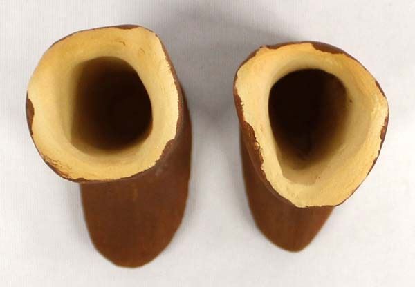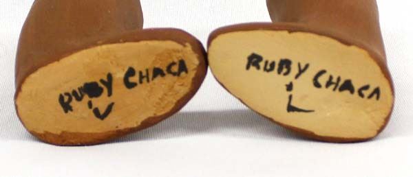 Native American Hopi Pottery Moccasin Boots by Ruby Chaca, measure 2'' x 3'' x 1'' and are signed on the soles